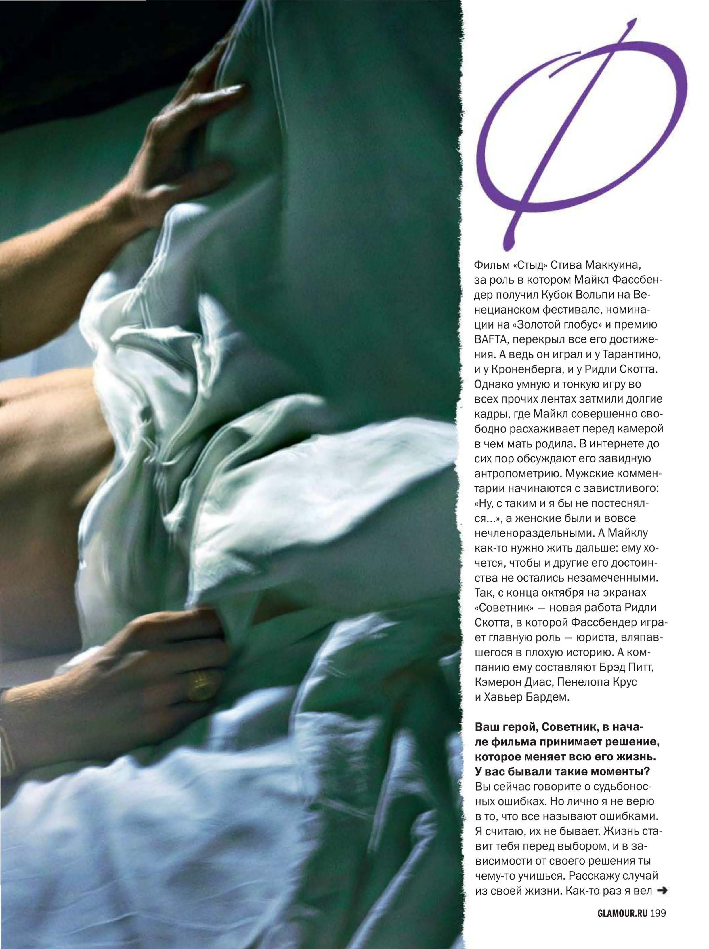 MF: Все что вы можете сделать, это абстрагироваться от всего. Это немного разочаровывает, потому что я хотел, чтобы люди смотрели фильм ради его смысла, а не ради этого предмета всеобщего обсуждения. Но что ты им можешь сказать:"Это не очень красиво! Прекратите обсуждать мой пенис!" Порой необходимо не обращать внимание на чужие мнения. Я смотрел интервью с Эриком Катона, и они обсуждали его трофеи и награды. И он признался"В моём доме я ничего из этого не держу. Они нагоняют на меня депрессию. Это заставляет зацикливаться на прошлом. Я думаю о том, что я собираюсь сделать завтра." Я думаю, это правильная установка. "12 лет рабства" и "Советник" закончены. Теперь я думаю о том, что я должен делать дальше. Мне следует к этому подготовиться.