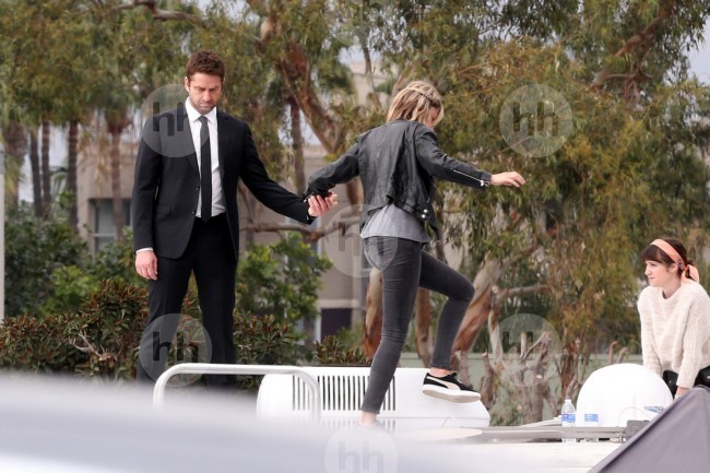 West Hollywood, CA - Gerard Butler flashes a smile after a night out at The Nice Guy in West Hollywood. The '300' actor dressed casual in a leather jacket, button down shirt and jeans.