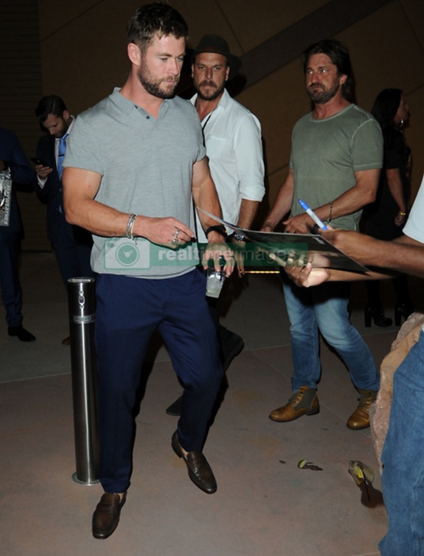 Gerard Butler bumps into Chris Hemsworth as he attends the Mayweather/McGregor fight at the T-Mobile Arena in Las Vegas
