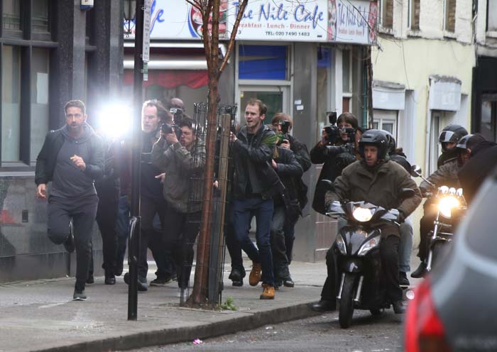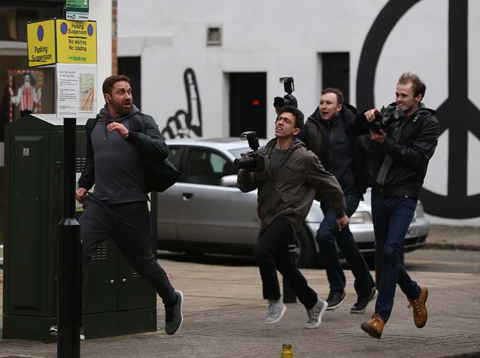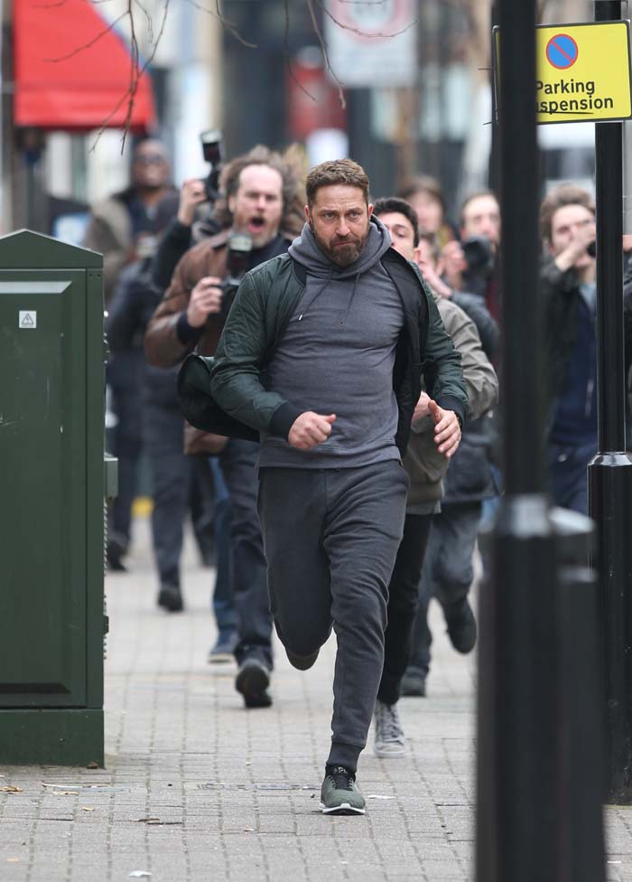Реальная жизнь ... или жизнь катушки (ролика)? Джерард Батлер бежит из папарацци во время съемок рекламного ролика в четверг в Лондоне