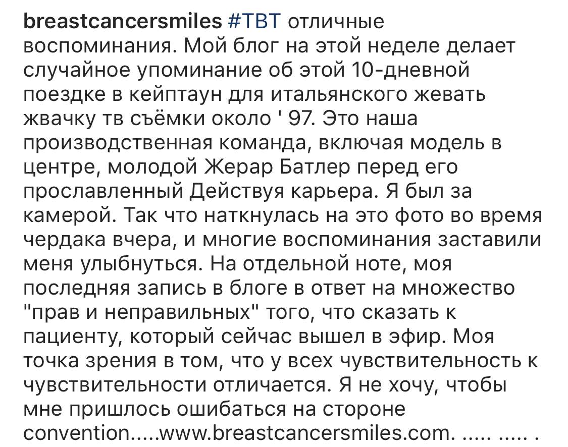 "История за этой картиной ... в конце каждого дня мне приходилось снимать макияж с тела Джерарда Батлера и кусочки бороды. После нескольких месяцев съемок, этот день был как раз перед рождественскими каникулами, Джерри уезжал на следующий день на каникулы, и я подумал попросить нескольких визажистов помочь мне ускорить процесс ... это выражение стоит тысяча слов! Люблю тебя Джерри! Вы были уважительными, скромными, веселыми, щедрыми и доступными для всей команды! У тебя красивая душа и большое сердце!"