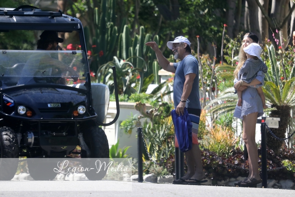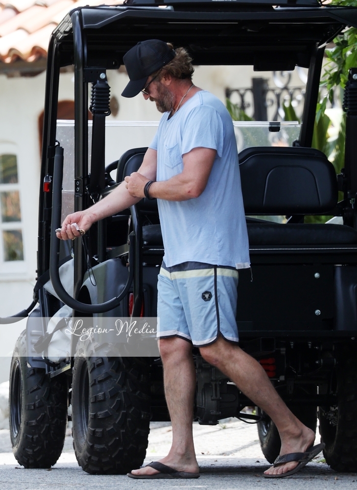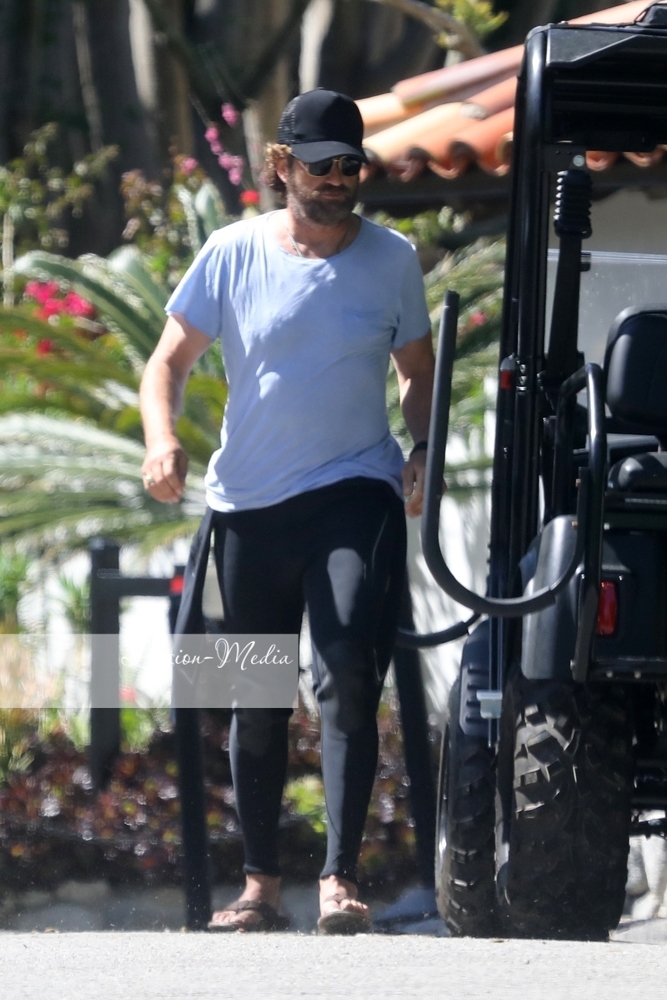 В какой-то момент он переоделся в гидрокостюм, а затем взял свою доску для серфинга и направился к Тихому океану на E-Z-Go Express 4x4 ATV для сольного серфинга. Во время своей короткой поездки, звезда "Падшего Ангела" столкнулся с местным соседом и актером, Джошем Бролином, его женой Кэтрин Бойд и их дочерью Уэстлин. Он остановился и поболтал с парой в течение нескольких минут, все это время соблюдая социальную дистанцию.