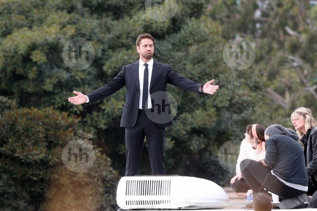 West Hollywood, CA - Gerard Butler flashes a smile after a night out at The Nice Guy in West Hollywood. The '300' actor dressed casual in a leather jacket, button down shirt and jeans.