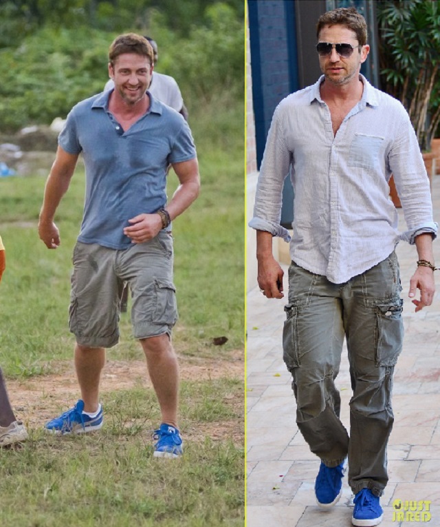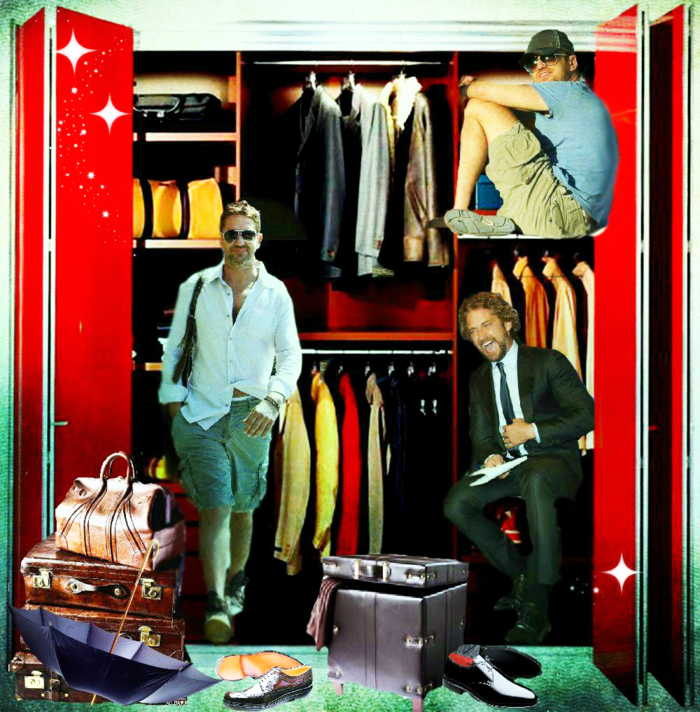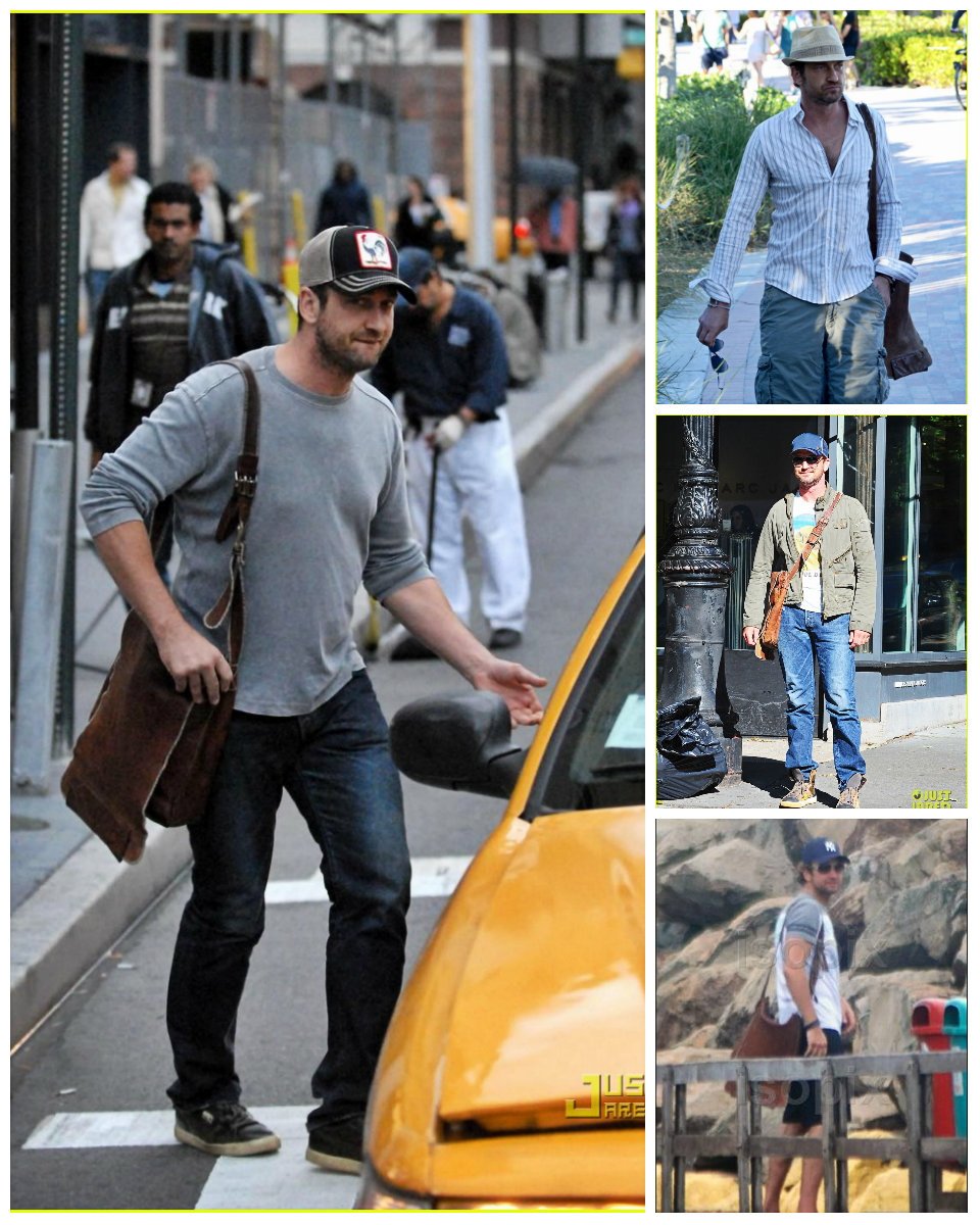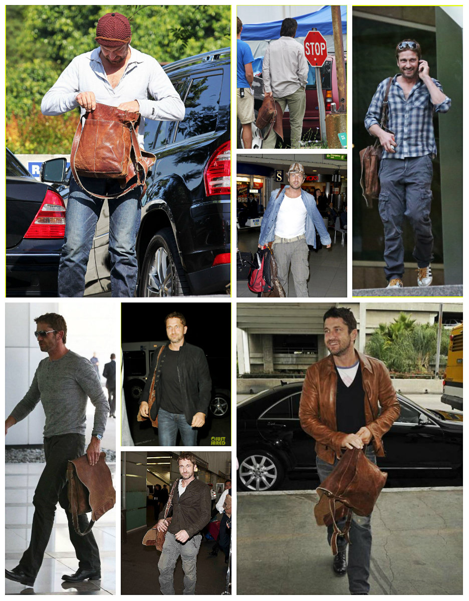 Среди прочего, приоритет можно смело отдать кожаной сумке. Мы не знаем точно дату приобретения, но уже в октябре 2006 года, эта сумка, а вернее, сума переметная уже мертвой хваткой вцепилась в крепкое плечо Батлера. И вот уже на протяжении многих лет редко какая соперница на короткое вырывает это первенство. Старую любовь не забыть! Эта сумка знает все тайны своего хозяина. Чего только не хранила она в своем чреве! Можете домысливать и сочинять что угодно, но тайну она не раскроет никогда, даже под страхом смерти. И тайна эта умрет вместе с ней, хотя она-то как раз умирать не собирается и несмотря на потрепанный внешний вид, выглядит вполне еще ОГО-ГО!!! Доказательство этому прибытие Ее Величества(сумки) в Сидней в марте этого года. Разве какая-то рухлядь смогла бы преодолеть такое расстояние? Ответ легко и непринужденно напрашивается сам собой. Конечно, нет. Поэтому приготовимся любоваться ей еще долгие и долгие лета. Тем более, что рядом такой преданный человек- Джерри Батлер, а рядом с таким хозяином — красивым, сильным, надежным годы не ощущаются вовсе. "Люди привыкают к определённым вещам, привязываются к ним, как к домашним питомцам, любят их не только за удобство использования, но порой и за то, что данная вещь стала свидетелем того или иного радостного события или, напротив, трудного периода в их жизни, который, к счастью благополучно завершился." На этом наши расследования не заканчиваются. И мы плавно (или не очень) переходим к любимым шортам Джерри (подобного стиля он придерживается с 2010 года). Казалось бы, а с ними -то что? Ведь любой человек, прилетев в любую точку мира может без проблем купить за копейки этот предмет гардероба… Да, может, но не Джерри. И скорее всего не из-за того, что финансы не позволяют. Вернее, может и покупает, разные там экземпляры … Но эти! Эти — незаменимы! Потому что, как поется в известной песне, «не отрекаются любя». И эти шорты повсюду слепо следуют за хозяином. И одновременно привлекают взгляды и хранят самое святое. Иногда любимые вещи встречаются и играют как бы в одном кино, а режиссер их жизни и ролей — Джерри Батлер. Так же с 2010 года на актере можно наблюдать не менее любимые шорты цвета хаки. Мельком пробежим по футболкам. Пляжи, пробежки и встречи. Разнообразные амплуа делают их незаменимыми. Например, с того же 2010 года Джерри частенько прогуливался в серой футболке »Сolorado», в которой впервые был замечен на карнавале в Бразилии С сентября 2008 года незаменимым атрибутом гардероба Джерарда Батлера стала белая рубашка в полоску.