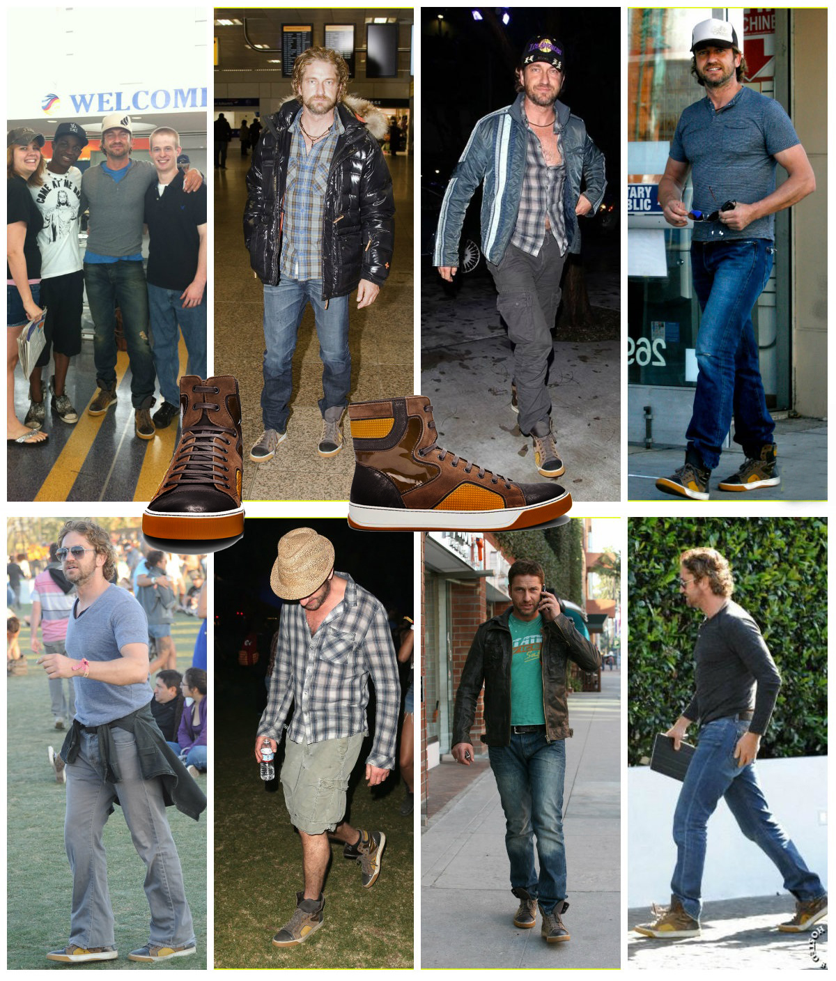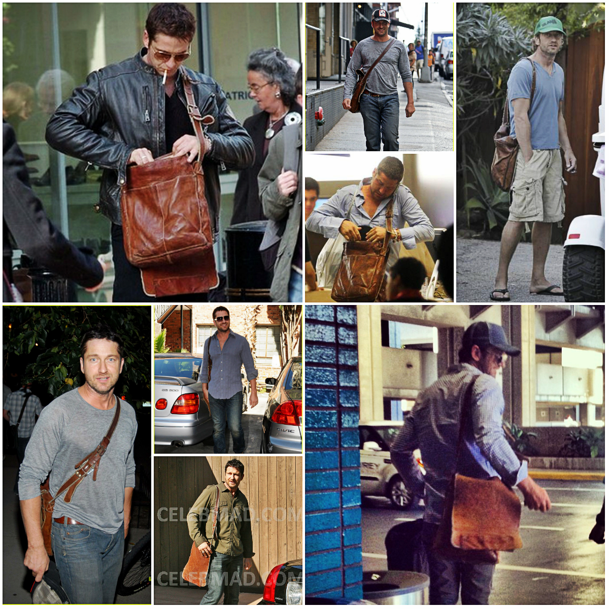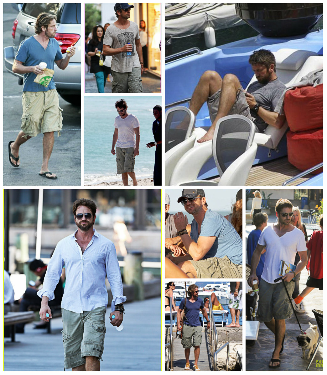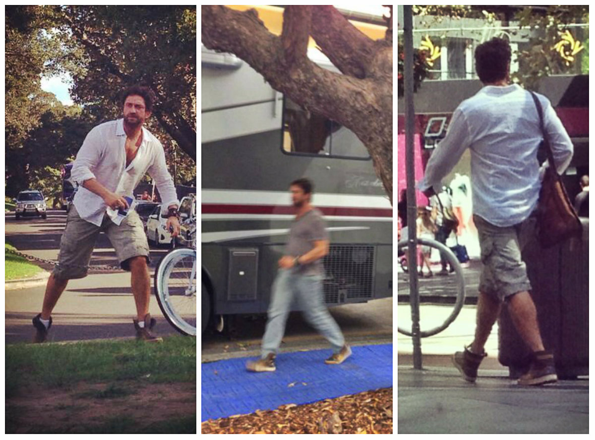 Среди прочего, приоритет можно смело отдать кожаной сумке. Мы не знаем точно дату приобретения, но уже в октябре 2006 года, эта сумка, а вернее, сума переметная уже мертвой хваткой вцепилась в крепкое плечо Батлера. И вот уже на протяжении многих лет редко какая соперница на короткое вырывает это первенство. Старую любовь не забыть! Эта сумка знает все тайны своего хозяина. Чего только не хранила она в своем чреве! Можете домысливать и сочинять что угодно, но тайну она не раскроет никогда, даже под страхом смерти. И тайна эта умрет вместе с ней, хотя она-то как раз умирать не собирается и несмотря на потрепанный внешний вид, выглядит вполне еще ОГО-ГО!!! Доказательство этому прибытие Ее Величества(сумки) в Сидней в марте этого года. Разве какая-то рухлядь смогла бы преодолеть такое расстояние? Ответ легко и непринужденно напрашивается сам собой. Конечно, нет. Поэтому приготовимся любоваться ей еще долгие и долгие лета. Тем более, что рядом такой преданный человек- Джерри Батлер, а рядом с таким хозяином — красивым, сильным, надежным годы не ощущаются вовсе. "Люди привыкают к определённым вещам, привязываются к ним, как к домашним питомцам, любят их не только за удобство использования, но порой и за то, что данная вещь стала свидетелем того или иного радостного события или, напротив, трудного периода в их жизни, который, к счастью благополучно завершился." На этом наши расследования не заканчиваются. И мы плавно (или не очень) переходим к любимым шортам Джерри (подобного стиля он придерживается с 2010 года). Казалось бы, а с ними -то что? Ведь любой человек, прилетев в любую точку мира может без проблем купить за копейки этот предмет гардероба… Да, может, но не Джерри. И скорее всего не из-за того, что финансы не позволяют. Вернее, может и покупает, разные там экземпляры … Но эти! Эти — незаменимы! Потому что, как поется в известной песне, «не отрекаются любя». И эти шорты повсюду слепо следуют за хозяином. И одновременно привлекают взгляды и хранят самое святое. Иногда любимые вещи встречаются и играют как бы в одном кино, а режиссер их жизни и ролей — Джерри Батлер. Так же с 2010 года на актере можно наблюдать не менее любимые шорты цвета хаки. Мельком пробежим по футболкам. Пляжи, пробежки и встречи. Разнообразные амплуа делают их незаменимыми. Например, с того же 2010 года Джерри частенько прогуливался в серой футболке »Сolorado», в которой впервые был замечен на карнавале в Бразилии С сентября 2008 года незаменимым атрибутом гардероба Джерарда Батлера стала белая рубашка в полоску.