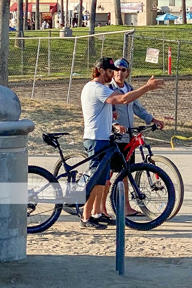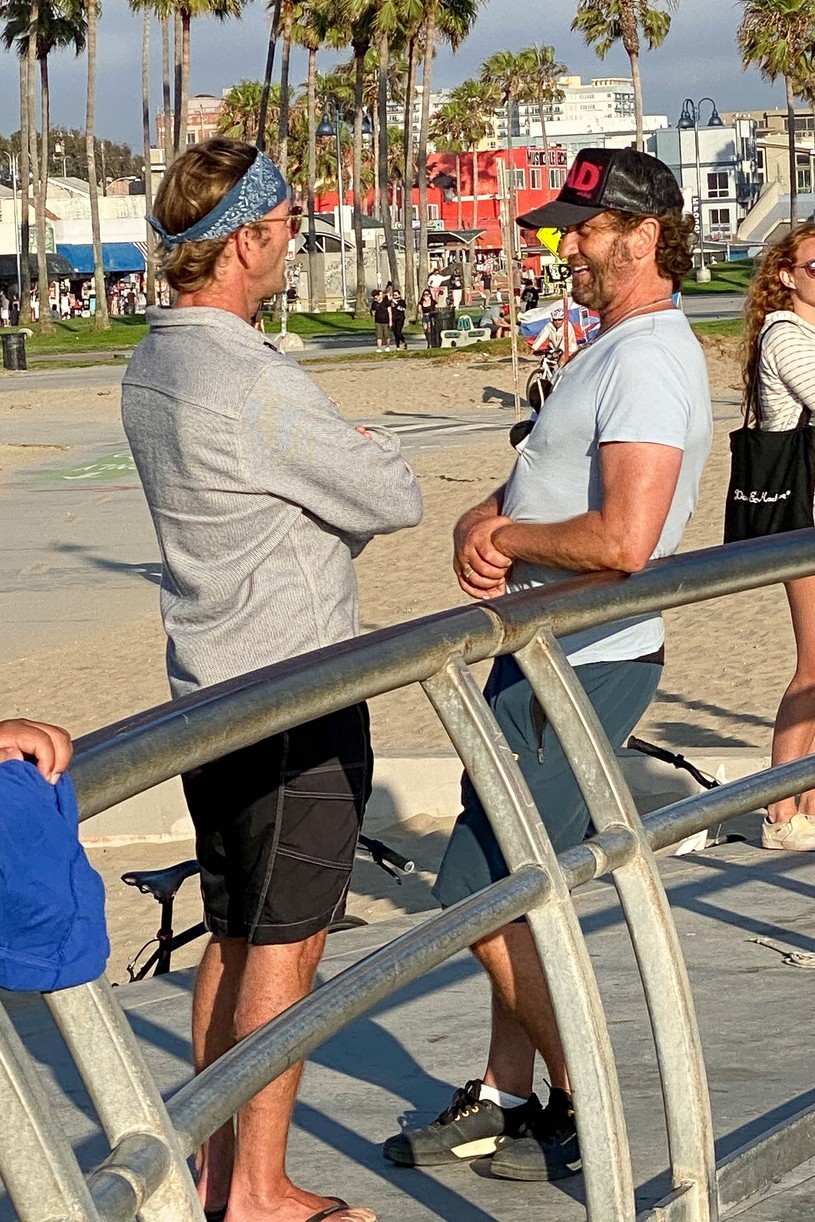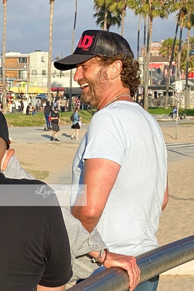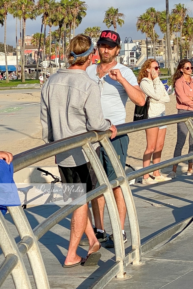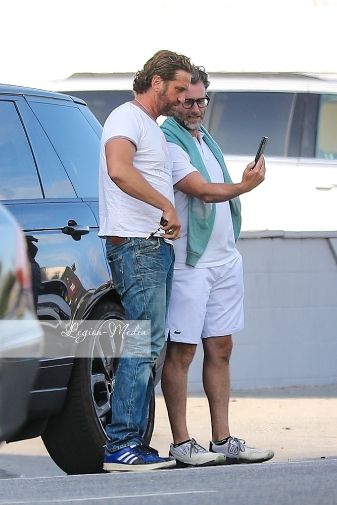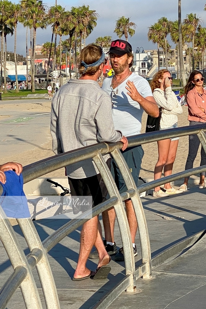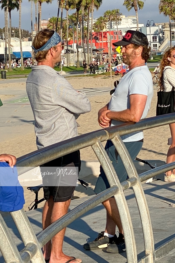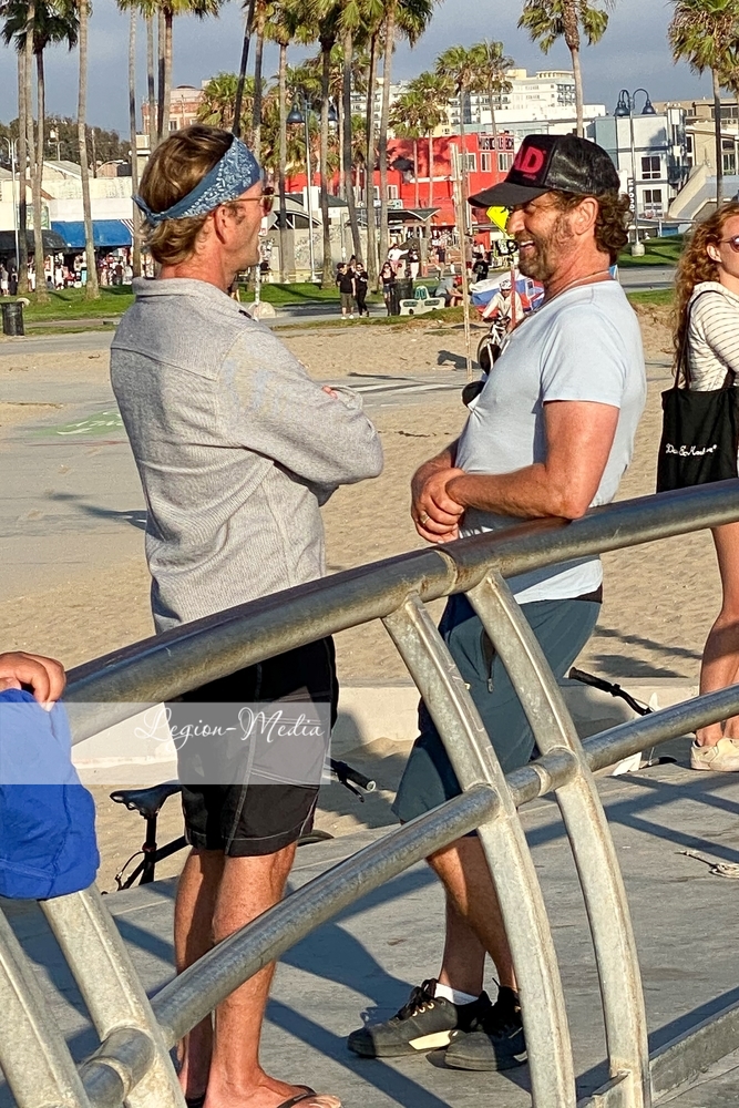 Лос-Анджелес, Калифорния-Джерард Батлер выходит на велосипедную прогулку и болтает с другом в Венис-Бич.