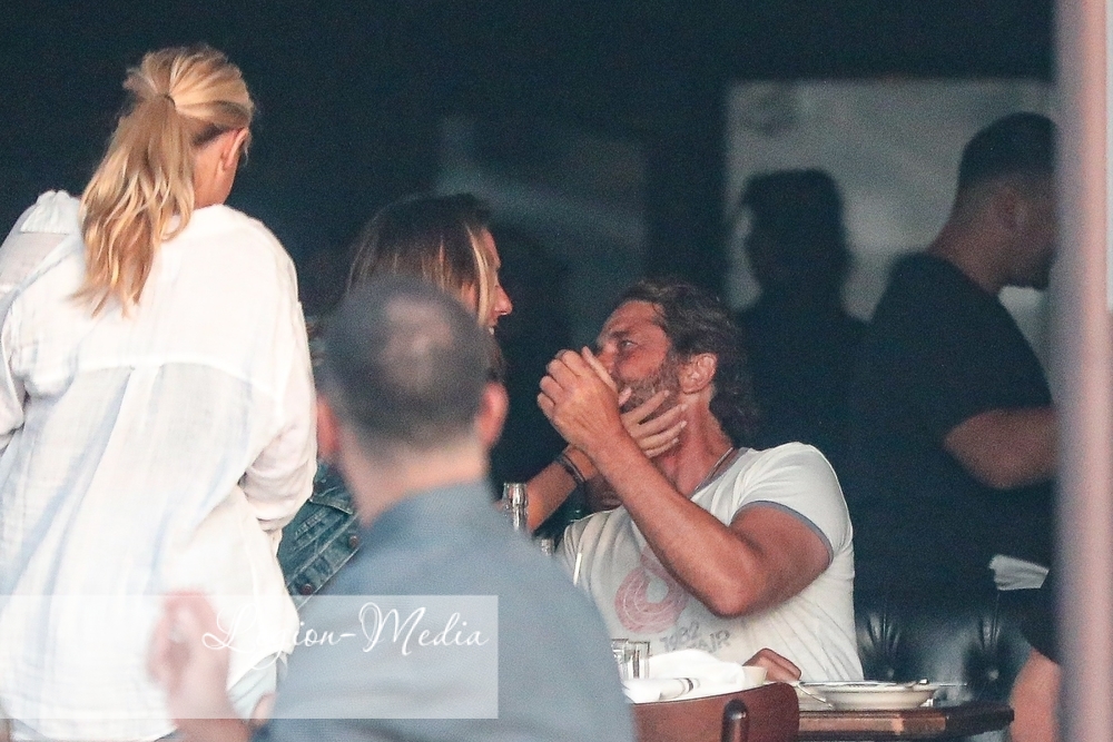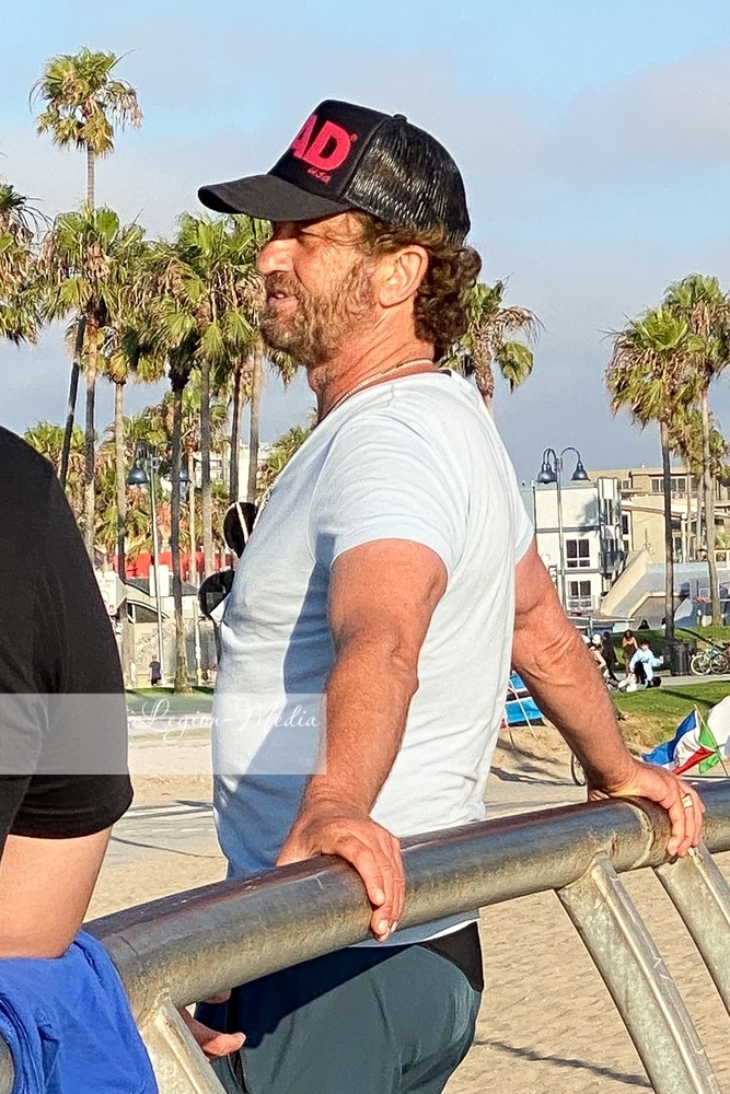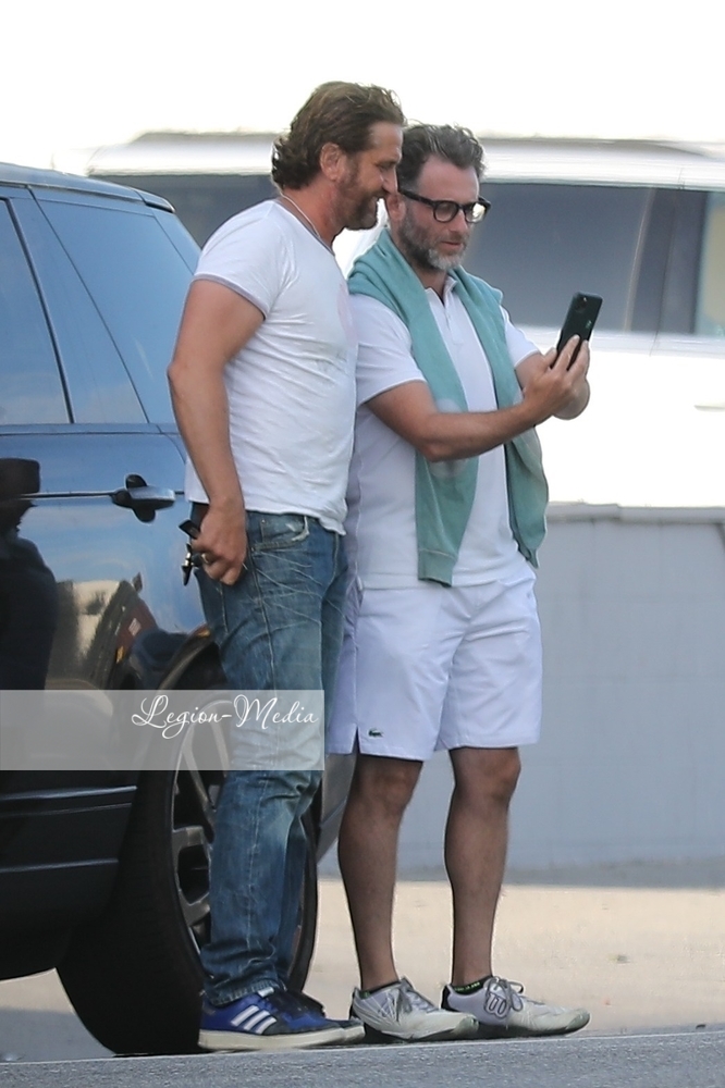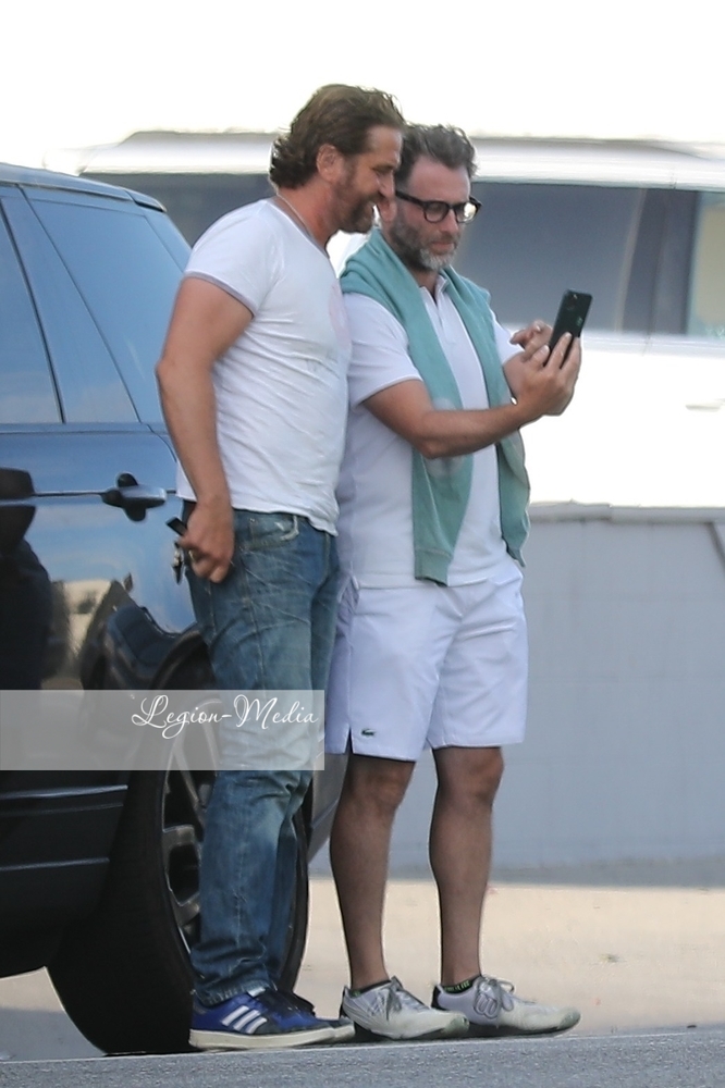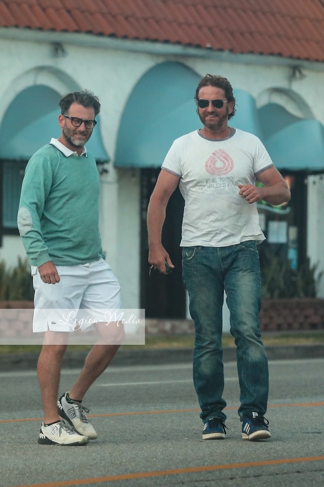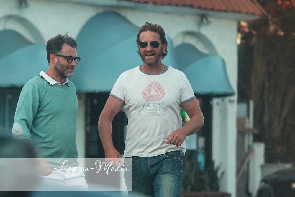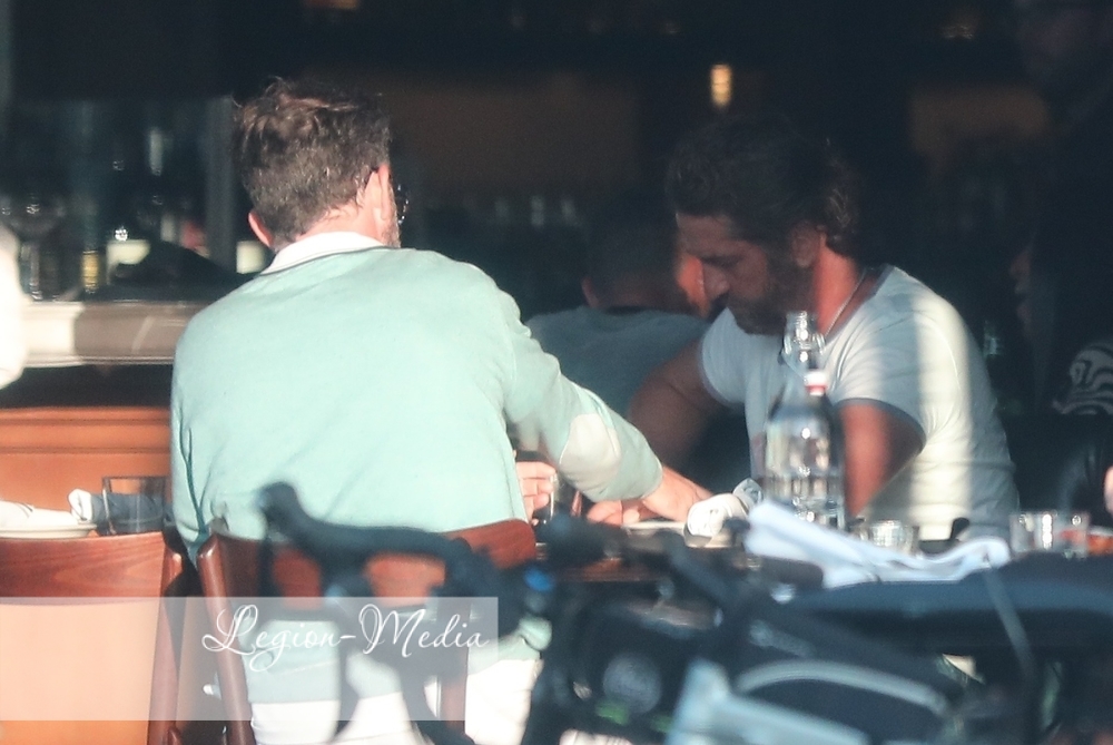 Джерард Батлер источает мужество, когда он и приятель встречаются с несколькими другими друзьями на обед и напитки в ресторане в Венеции
