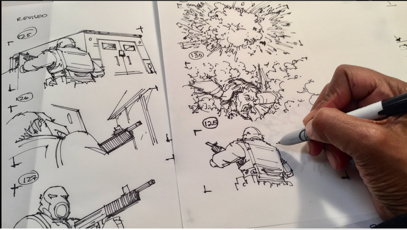 Вот Брайан с Джерардом Батлером и его пре-дизайном будущих кадров (раскадровкой) киностудии для фильма Логово Воров.