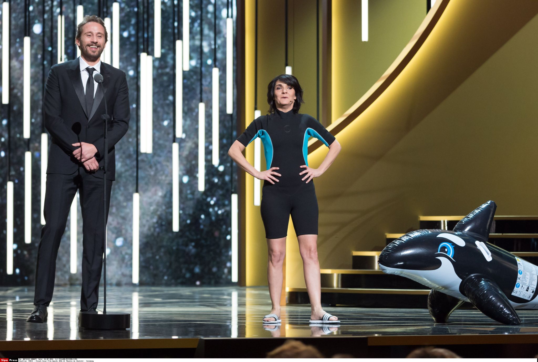 а это маленький ролик с комедийной актрисой Florence Foresti , которая прервала его, выйдя на сцену с надувной косаткой а-ля Марион Котийар
