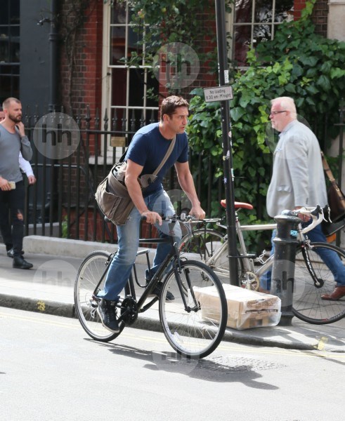 11.August.2016 - London - UK **EXCLUSIVE ALL ROUND PICTURES** 'London has Fallen' star Gerard Butler looks to have found another way to travel around the capital as the Scottish actor took to the streets of London on his bike.