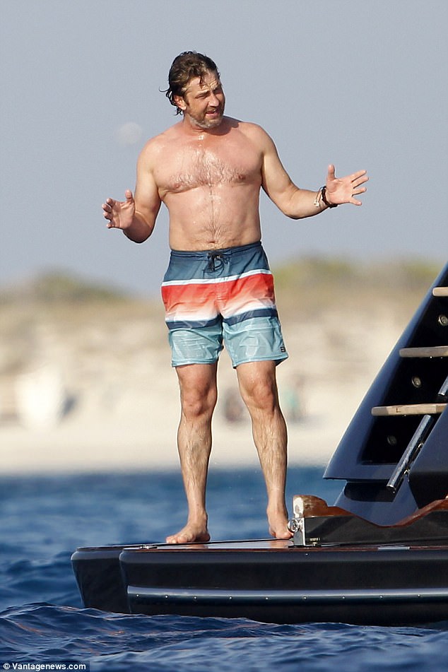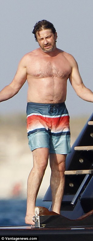 Shirtless Gerard Butler shows off his beefy frame in bright trunks as he makes a splash during Formentera getaway