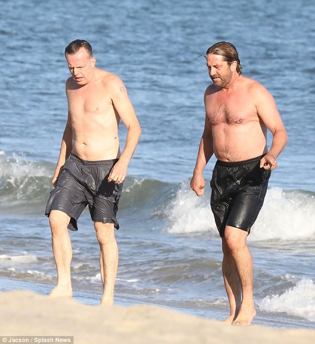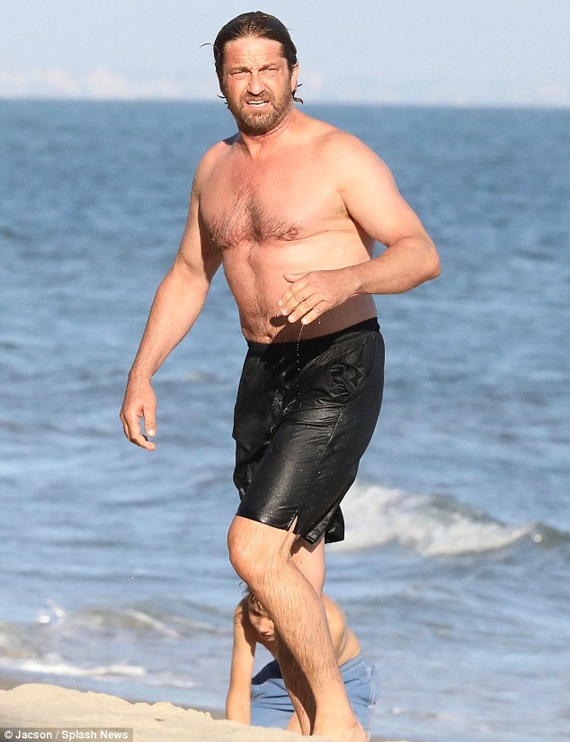 Shirtless Gerard Butler shows off his buff body as he enjoys some fun in the sun in Malibu