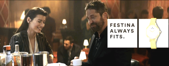 Реклама Festina с участием Джерарда Батлера в домашнем аэропорту бренда в Барселоне. "Запуск нашего первого в истории эксклюзивного набора, сочетающего кристаллы Swarovski и бесплатный браслет, помогает позиционировать Festina как ведущий бренд часов с точки зрения продаж на ряде авиакомпаний Европы.”