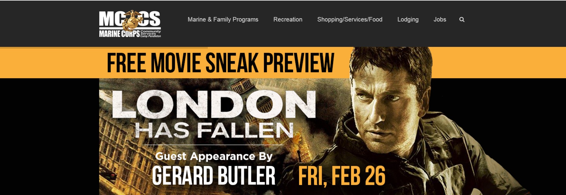 Bulldog Box Office, Mainside. Guest Appearance by actor, Gerard Butler! Times and details coming soon! See it before it hits theaters! Info @/theater Special Event