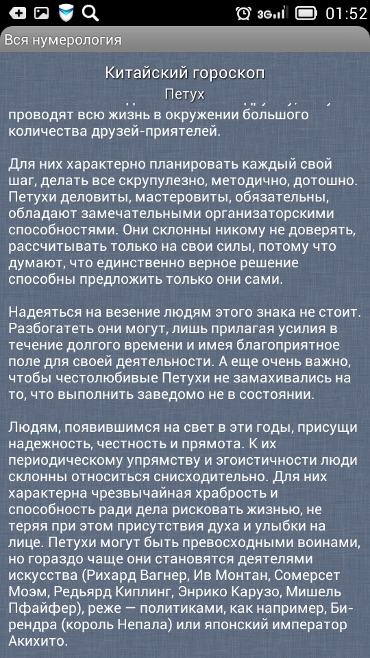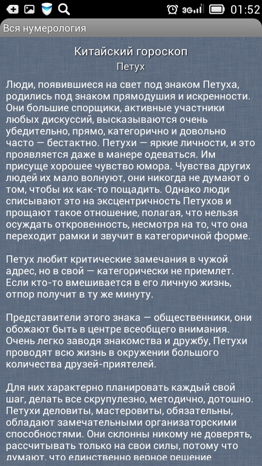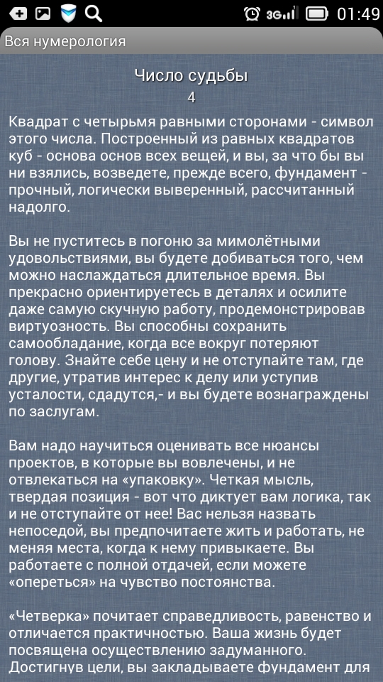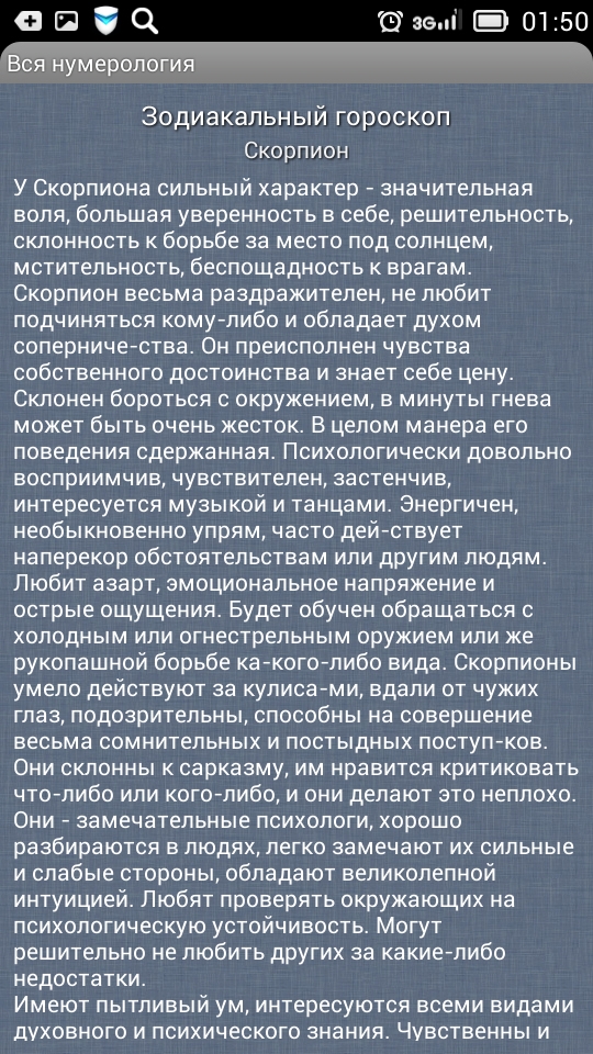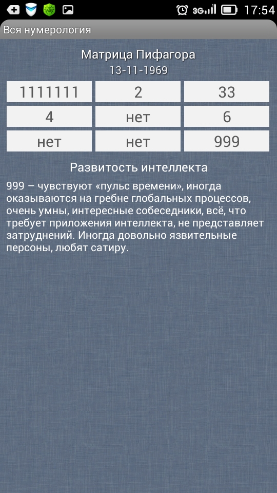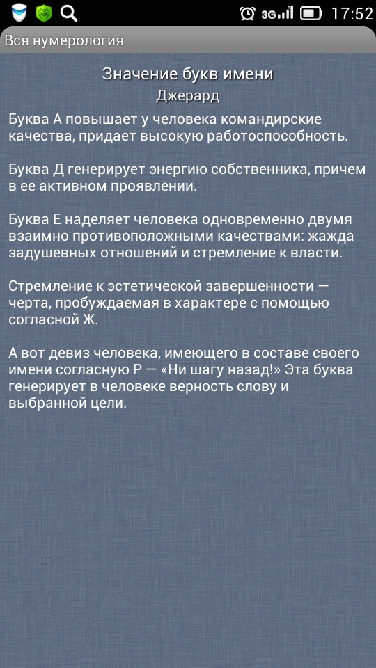 Девочки, я скачала себе приложение для смартфона "Вся нумерология" (вот об этой программе http://top-android.org/programs/5604-vsya-numerologiya/) ввела в нее данные о себе и своих родственниках (имя (кириллицей) и дату рождения) и все гороскопы и характеристики сошлись очень точно! (так что думаю эта программа дает верную информацию) :wink: Я ввела имя Жерард (так как английской G соответствует наша Ж, да и например имя Gerard по французски будет Жерар (тоже Ж), так что думаю не будет ошибкой написание Жерард) и его дату 13.11. 1969 г. вот что получилось, я сделала скрины. Мы с Roza84 подумали, что вы тоже должны это прочитать! :) ОЧЕНЬ ИНТЕРЕСНО! :D