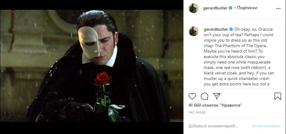 В предверии Хеллуина на ресурсах Джерарда Батлера в социальных сетях наблюдается небывалая активность Ладно, так Дракула не твоя чашка чая? Возможно, я смогу вдохновить вас нарядиться этим старичком, Призраком Оперы. Может, вы о нем слышали? Чтобы исполнить эту абсолютную классику, вам просто понадобится одна белая маскарадная маска, одна красная роза (с лентой!), Черный бархатный плащ, и, эй, если вы сможете быстро разбить люстру, вы получите здесь дополнительные очки. . Наконец, вы хотите завершить образ вечным горем, которое продлится до конца времен. 2020 год, можно набраться эмоций.