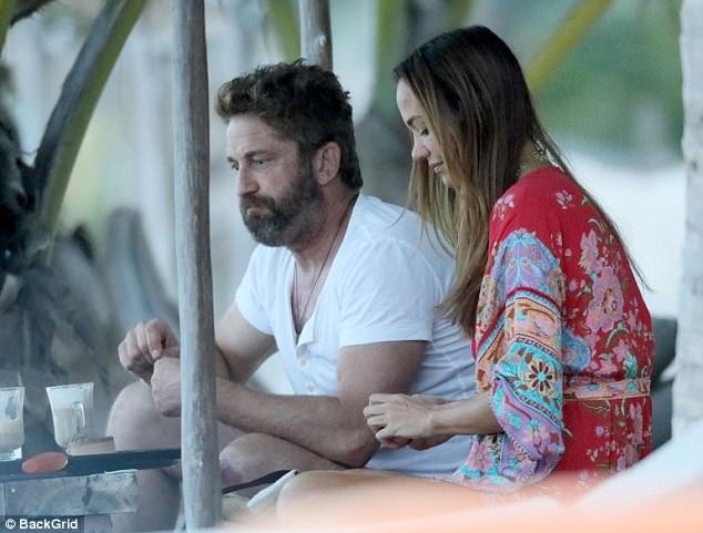 Gerard Butler shares a smooch with stunning make-up free girlfriend Morgan Brown as they enjoy a romantic lunch on the beach in Mexico