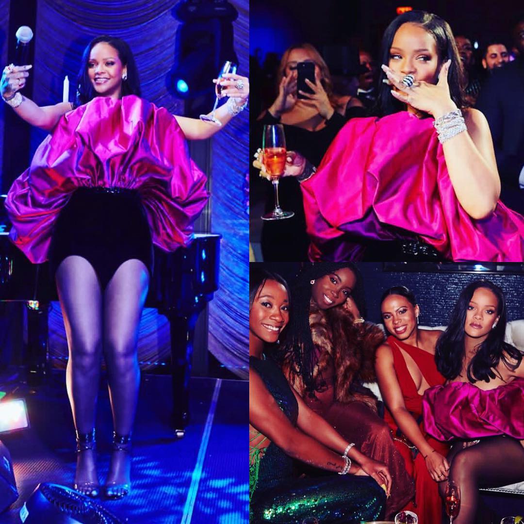 https://www.instagram.com/rihannadaily/ Для праздника она выбрала объемное платье цвета фуксии с открытыми плечами. Звезда дополнила образ массивными аксессуарами: серьгами с бриллиантами, кольцами и широким браслетом. Для дня рождения Рианна сделала объемную укладку и подчеркнула губы розовой помадой.
