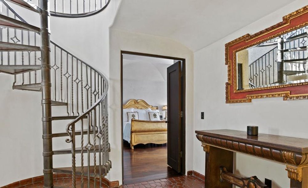 Three stories tall at the rear, with four bedrooms and four bathrooms, the almost-4,500-square-foot house was “extensively and tastefully” restored by set-designer-turned-interior-designer Elvis Restaino, and marries period details such as a turreted entry and beamed ceilings with state-of-the-art upgrades to mechanical systems and modern-day luxuries such as a screening room. A gated and secured entry courtyard with fairy lights strung through trees links, via an exterior staircase, to a petite but desirably flat backyard with a plunge-sized swimming pool and semicircular spa.