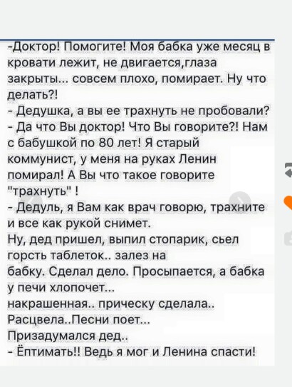 Слушайте, девочки, меня вдруг осенило! А анекдотец то с подтекстом. А что, для того, чтобы у мужа вновь к тебе интерес проснулся, может оно и надо иногда вот так, притворится то, ну типа ты тогос? Видите как бабке помогло?