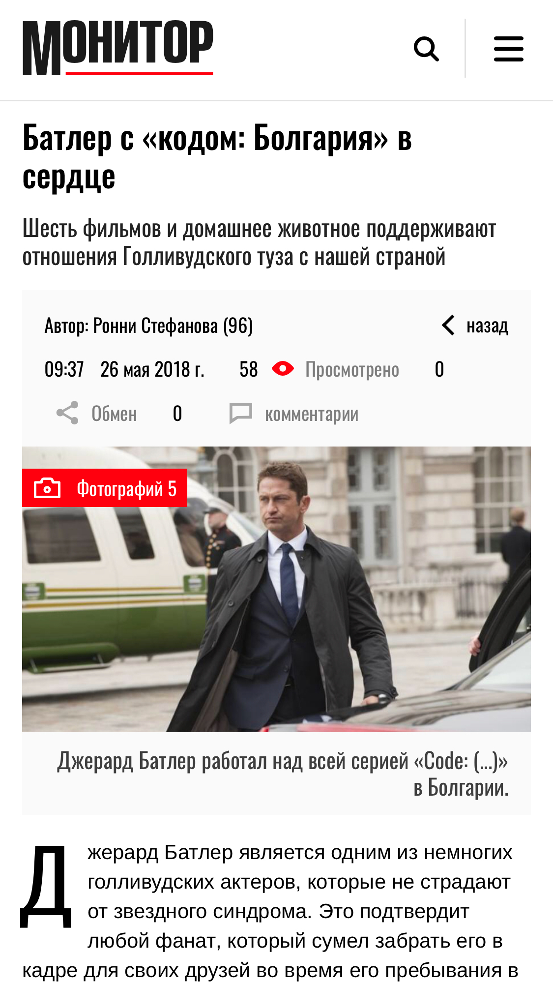 Джерард Батлер является одним из немногих голливудских актеров, которые не страдают от звездного синдрома. Это подтвердит любой фанат, который сумел забрать его в кадре для своих друзей во время его пребывания в нашей стране. В настоящее время Болгария уже является третьим родителем Батлера (он родился в Шотландии и работает в основном в Соединенных Штатах), и подсчет числа его подборов нашему отцу кажется мне слишком сложной математической задачей.