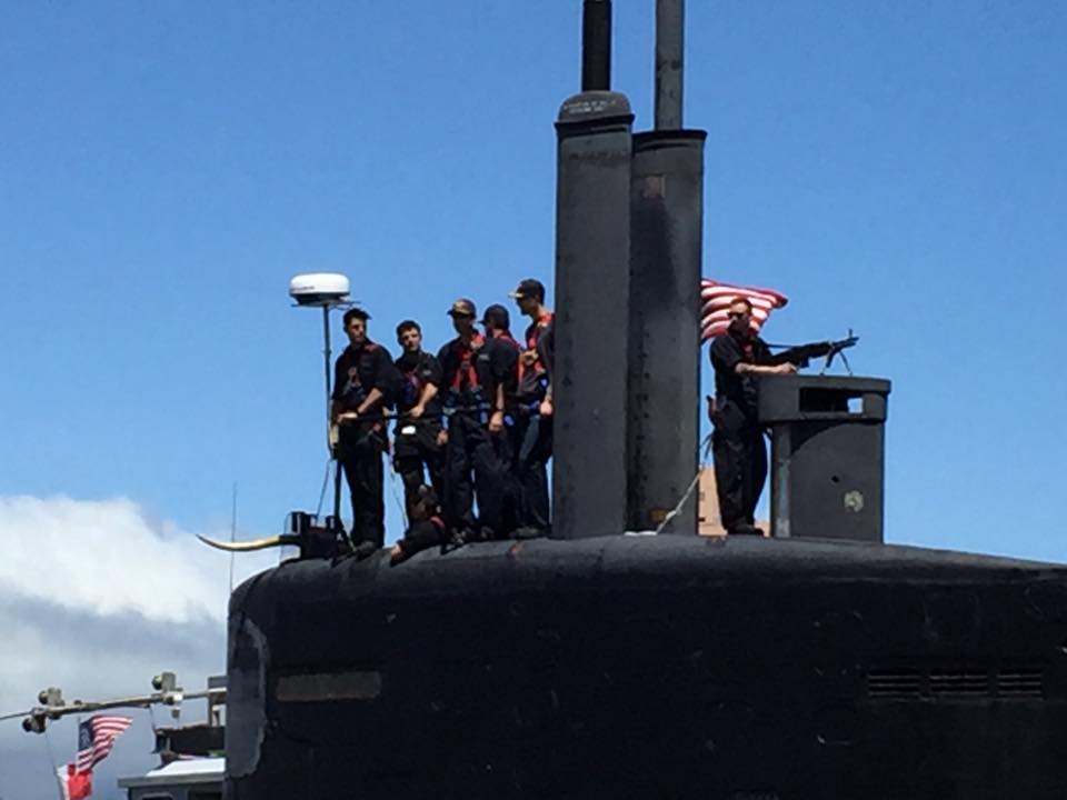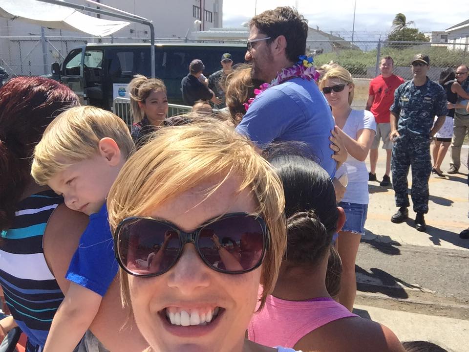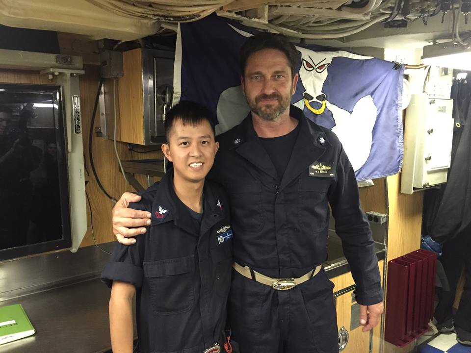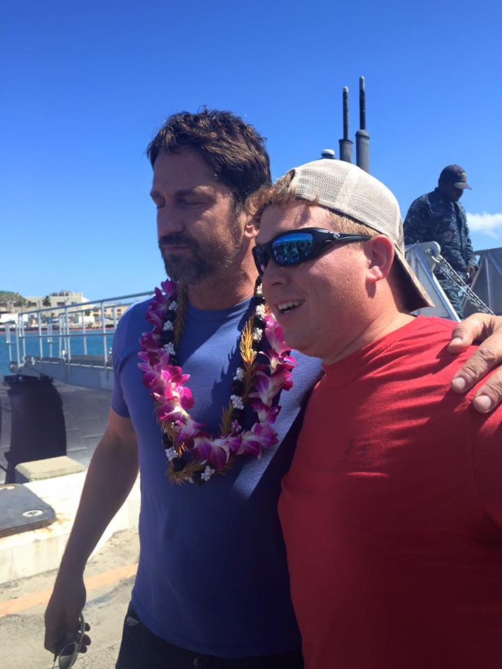 Olivia and Gerard Butler in front of the USS Houston in Hawaii . Lucky girl!