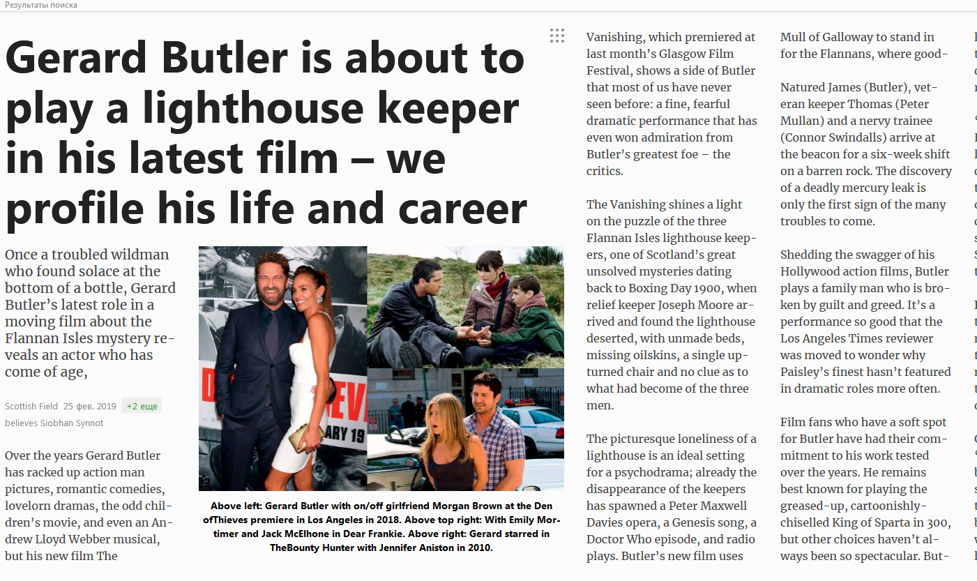 Тем не менее, в фильме на наших экранах на этой неделе опекуном является «Исчезновение - загадка света», снятая датским режиссером Кристоффером Найхолмом и Питером Мулланом в главной роли, Гэри Льюисом и другими коллегами, а также Батлер, который также является сопродюсером фильма. маяка на необитаемом острове в 20 милях от шотландского побережья и участвует в темной истории, которая действительно произошла.