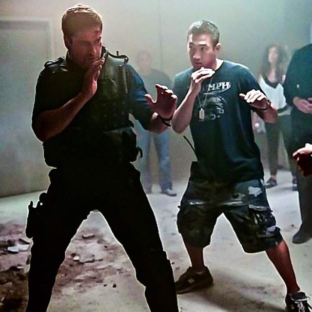 И текст- @LinOeding knows the importance of fitness!! As one of the top Hollywood Fight Choreographers & Trainers, being physically fit is key!! Follow him to check out more photos!! @LinOeding #OlympusHasFallen #GerardButler #BehindTheScenes