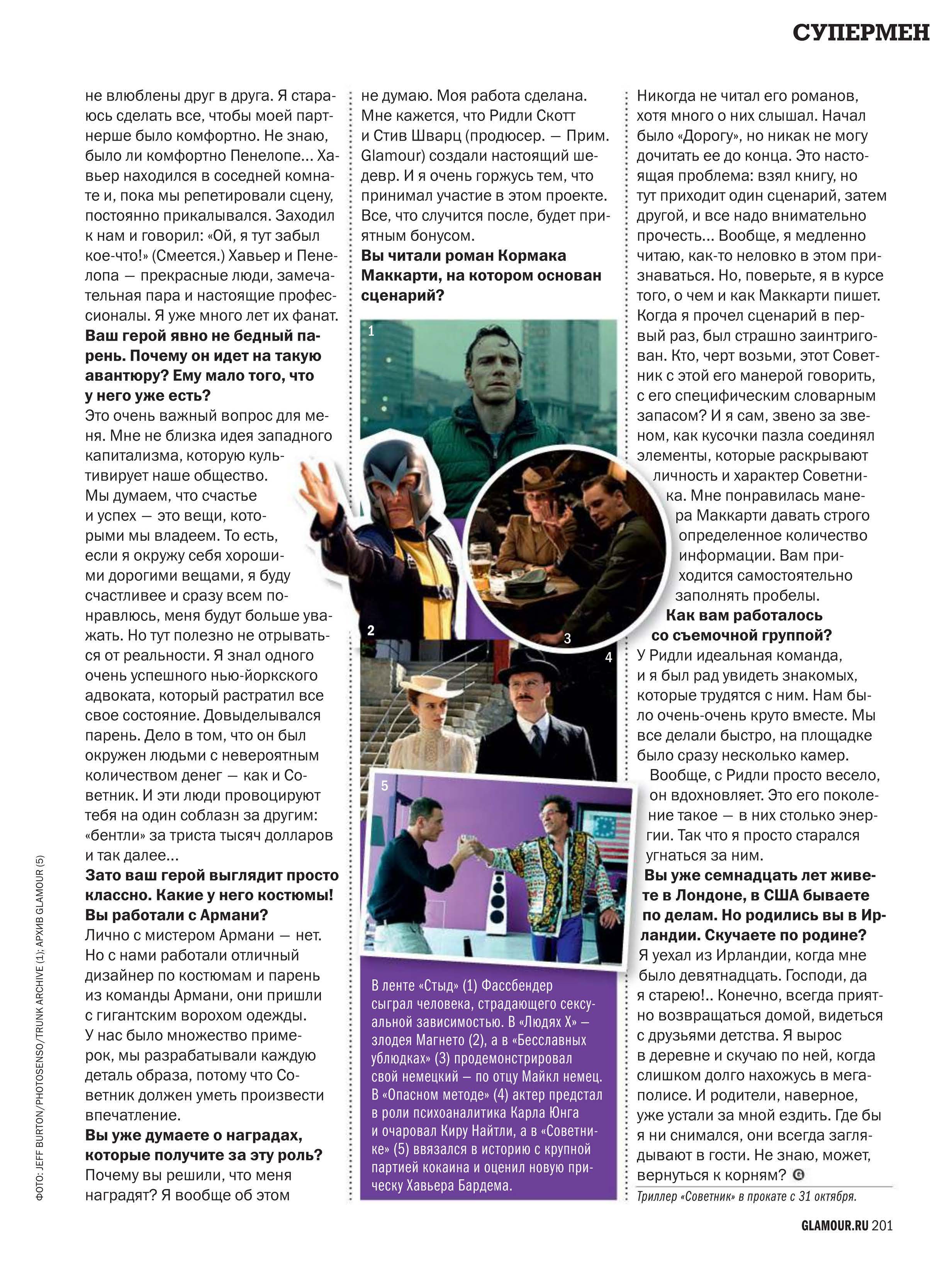 MF: Все что вы можете сделать, это абстрагироваться от всего. Это немного разочаровывает, потому что я хотел, чтобы люди смотрели фильм ради его смысла, а не ради этого предмета всеобщего обсуждения. Но что ты им можешь сказать:"Это не очень красиво! Прекратите обсуждать мой пенис!" Порой необходимо не обращать внимание на чужие мнения. Я смотрел интервью с Эриком Катона, и они обсуждали его трофеи и награды. И он признался"В моём доме я ничего из этого не держу. Они нагоняют на меня депрессию. Это заставляет зацикливаться на прошлом. Я думаю о том, что я собираюсь сделать завтра." Я думаю, это правильная установка. "12 лет рабства" и "Советник" закончены. Теперь я думаю о том, что я должен делать дальше. Мне следует к этому подготовиться.