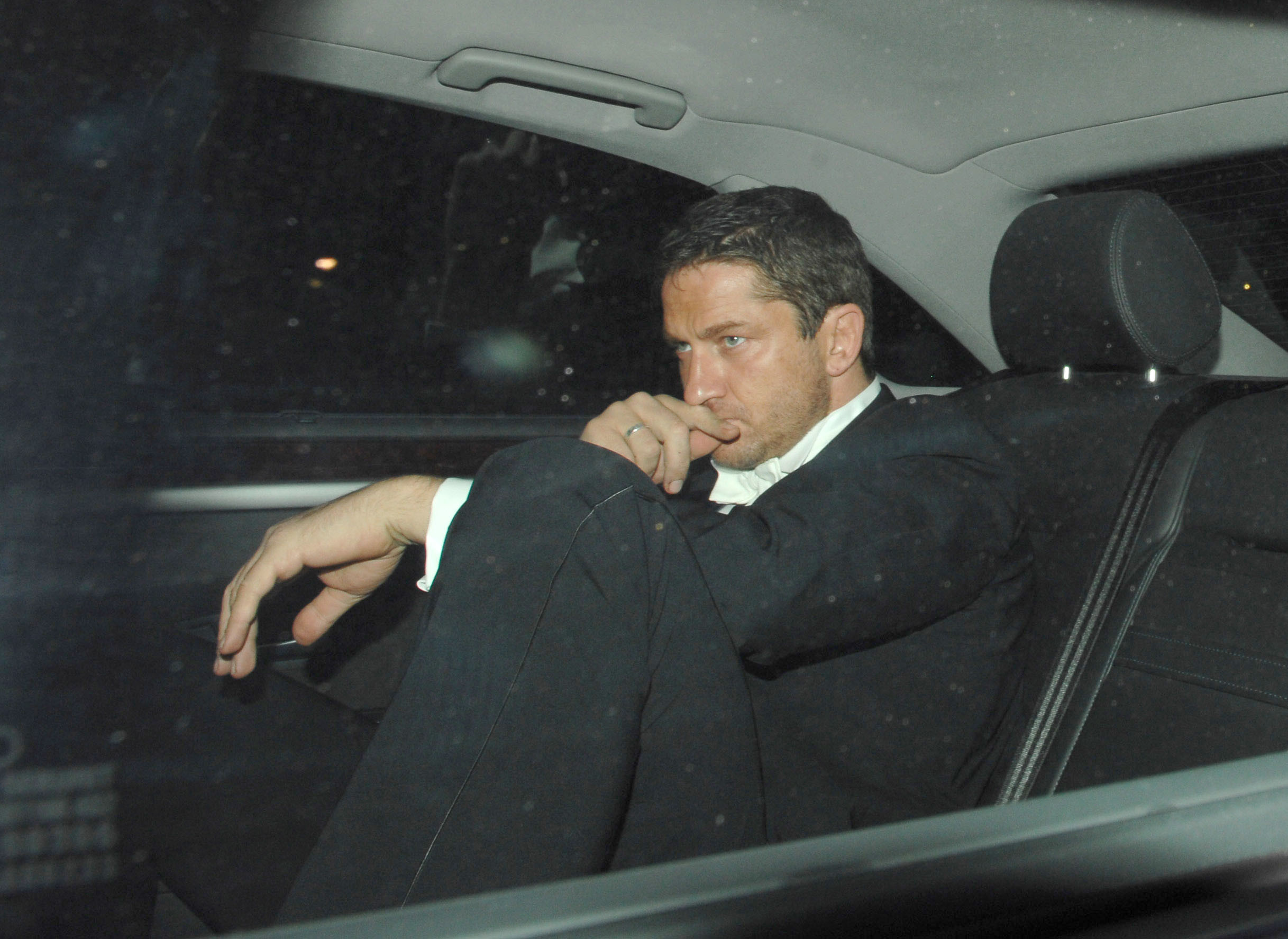 Gerard Butler Arrives at Sir Elton Johns White Tie & Tiara Ball at His Home in Old Windsor.