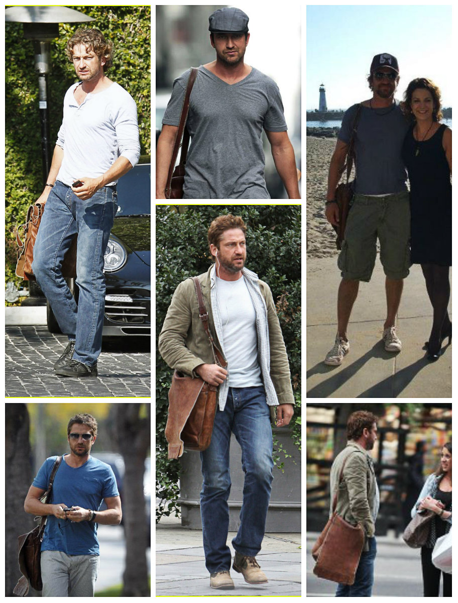 Среди прочего, приоритет можно смело отдать кожаной сумке. Мы не знаем точно дату приобретения, но уже в октябре 2006 года, эта сумка, а вернее, сума переметная уже мертвой хваткой вцепилась в крепкое плечо Батлера. И вот уже на протяжении многих лет редко какая соперница на короткое вырывает это первенство. Старую любовь не забыть! Эта сумка знает все тайны своего хозяина. Чего только не хранила она в своем чреве! Можете домысливать и сочинять что угодно, но тайну она не раскроет никогда, даже под страхом смерти. И тайна эта умрет вместе с ней, хотя она-то как раз умирать не собирается и несмотря на потрепанный внешний вид, выглядит вполне еще ОГО-ГО!!! Доказательство этому прибытие Ее Величества(сумки) в Сидней в марте этого года. Разве какая-то рухлядь смогла бы преодолеть такое расстояние? Ответ легко и непринужденно напрашивается сам собой. Конечно, нет. Поэтому приготовимся любоваться ей еще долгие и долгие лета. Тем более, что рядом такой преданный человек- Джерри Батлер, а рядом с таким хозяином — красивым, сильным, надежным годы не ощущаются вовсе. "Люди привыкают к определённым вещам, привязываются к ним, как к домашним питомцам, любят их не только за удобство использования, но порой и за то, что данная вещь стала свидетелем того или иного радостного события или, напротив, трудного периода в их жизни, который, к счастью благополучно завершился." На этом наши расследования не заканчиваются. И мы плавно (или не очень) переходим к любимым шортам Джерри (подобного стиля он придерживается с 2010 года). Казалось бы, а с ними -то что? Ведь любой человек, прилетев в любую точку мира может без проблем купить за копейки этот предмет гардероба… Да, может, но не Джерри. И скорее всего не из-за того, что финансы не позволяют. Вернее, может и покупает, разные там экземпляры … Но эти! Эти — незаменимы! Потому что, как поется в известной песне, «не отрекаются любя». И эти шорты повсюду слепо следуют за хозяином. И одновременно привлекают взгляды и хранят самое святое. Иногда любимые вещи встречаются и играют как бы в одном кино, а режиссер их жизни и ролей — Джерри Батлер. Так же с 2010 года на актере можно наблюдать не менее любимые шорты цвета хаки. Мельком пробежим по футболкам. Пляжи, пробежки и встречи. Разнообразные амплуа делают их незаменимыми. Например, с того же 2010 года Джерри частенько прогуливался в серой футболке »Сolorado», в которой впервые был замечен на карнавале в Бразилии С сентября 2008 года незаменимым атрибутом гардероба Джерарда Батлера стала белая рубашка в полоску.