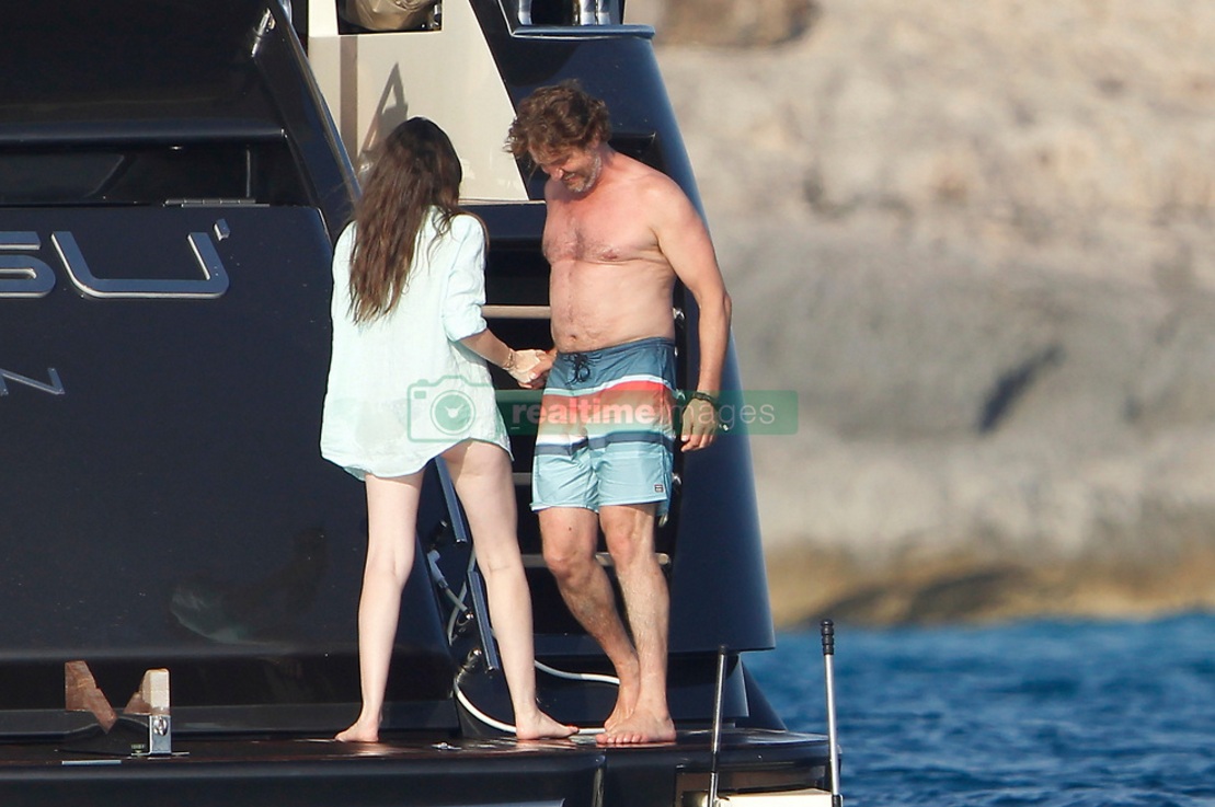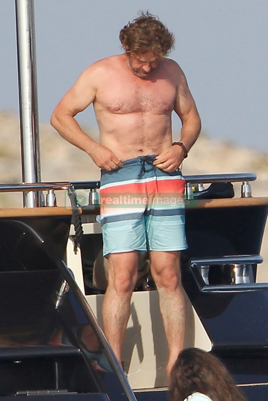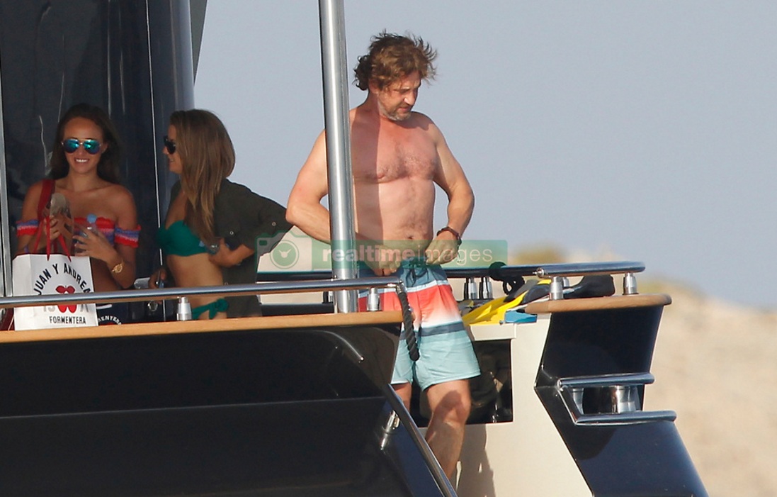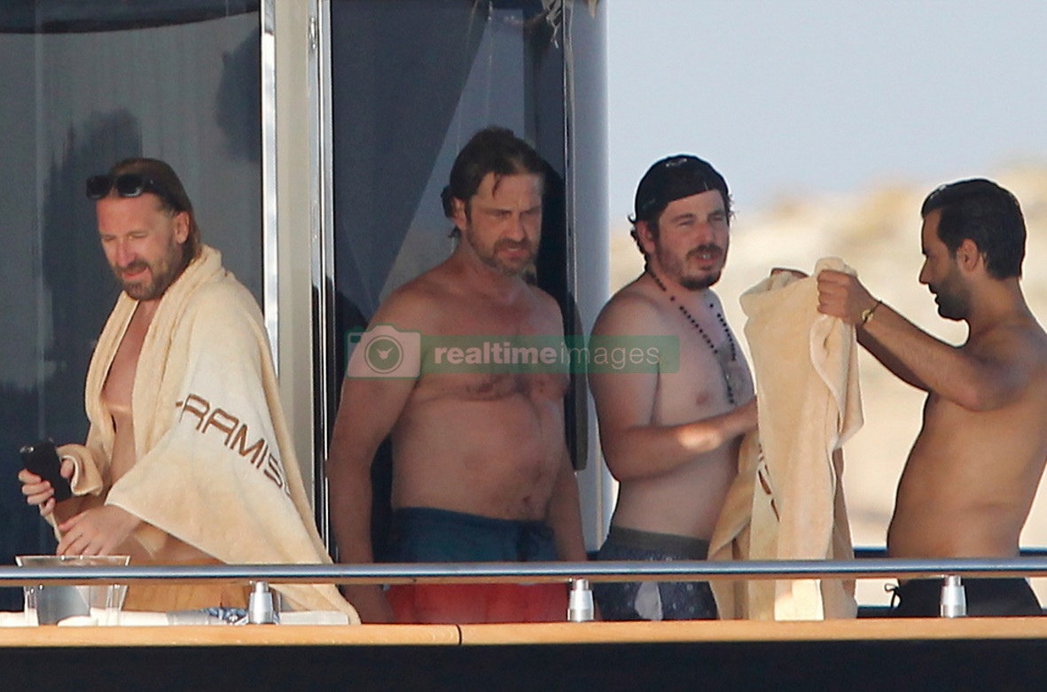 EXCLUSIVE Actor Gerard Butler visits the island of Formentera (Spain) accompanied by friends on board a large yacht. Have eaten at one of the trendy restaurants, have sunbathed on beach hammocks and have given a refreshing swim in the crystal clear waters of the island