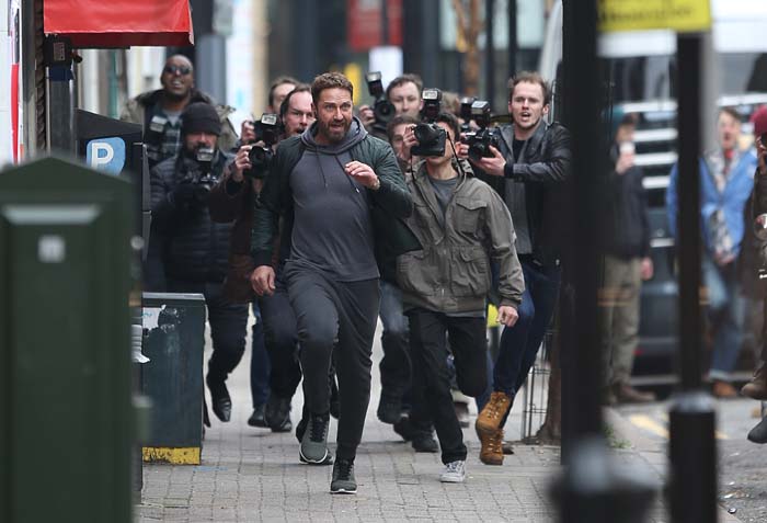 Реальная жизнь ... или жизнь катушки (ролика)? Джерард Батлер бежит из папарацци во время съемок рекламного ролика в четверг в Лондоне