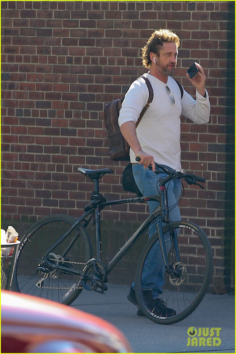 Джерар Батлер направляется на встречу на велосипеде в Нью-Йорке в понедельник днем (9 марта).