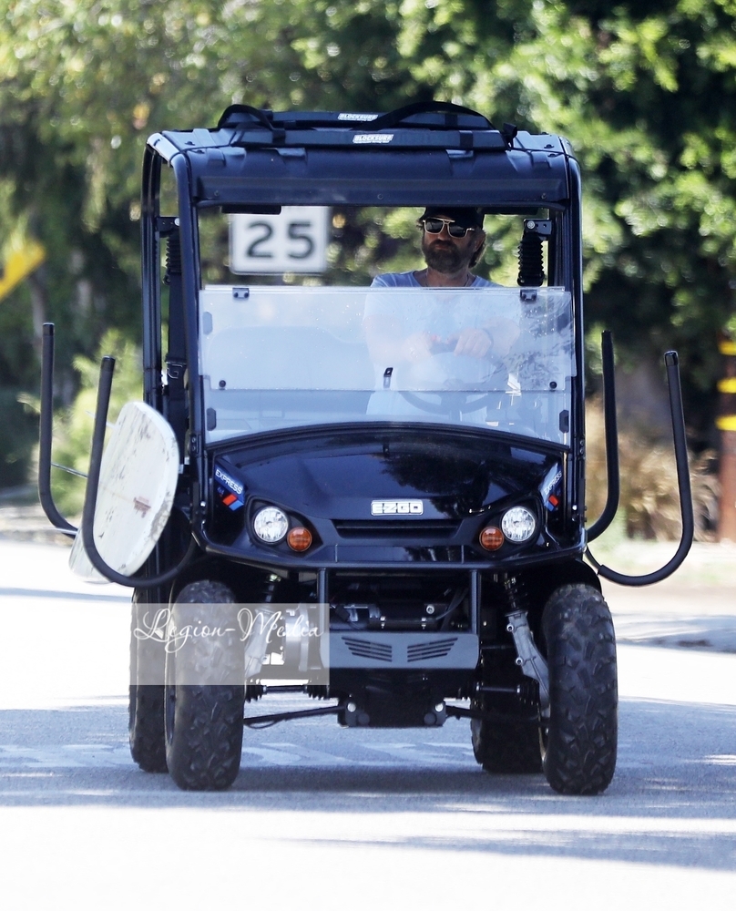 В какой-то момент он переоделся в гидрокостюм, а затем взял свою доску для серфинга и направился к Тихому океану на E-Z-Go Express 4x4 ATV для сольного серфинга. Во время своей короткой поездки, звезда "Падшего Ангела" столкнулся с местным соседом и актером, Джошем Бролином, его женой Кэтрин Бойд и их дочерью Уэстлин. Он остановился и поболтал с парой в течение нескольких минут, все это время соблюдая социальную дистанцию.