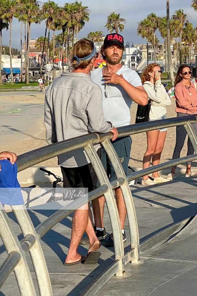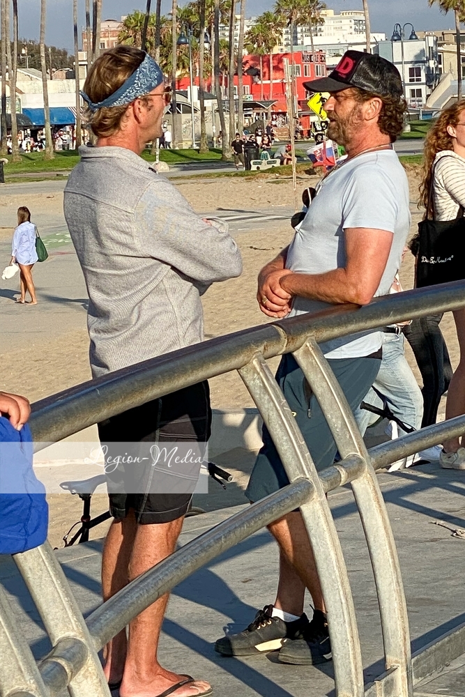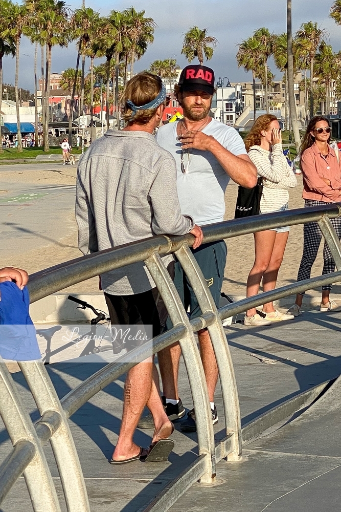 Лос-Анджелес, Калифорния-Джерард Батлер выходит на велосипедную прогулку и болтает с другом в Венис-Бич.