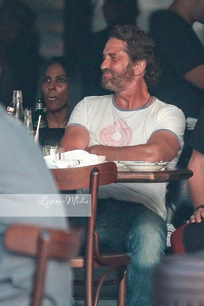 Джерард Батлер источает мужество, когда он и приятель встречаются с несколькими другими друзьями на обед и напитки в ресторане в Венеции