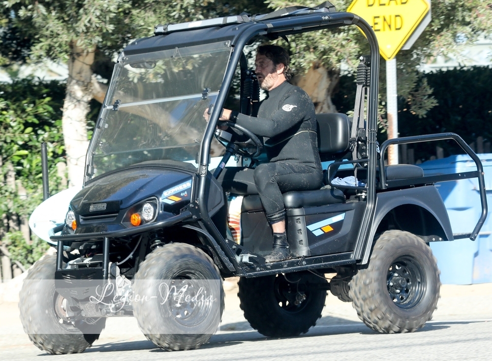 Gerard Butler Drives His Express Golf Cart Back To His House Wearing His Wetsuit After Getting In A Surf Session In Malibu.
