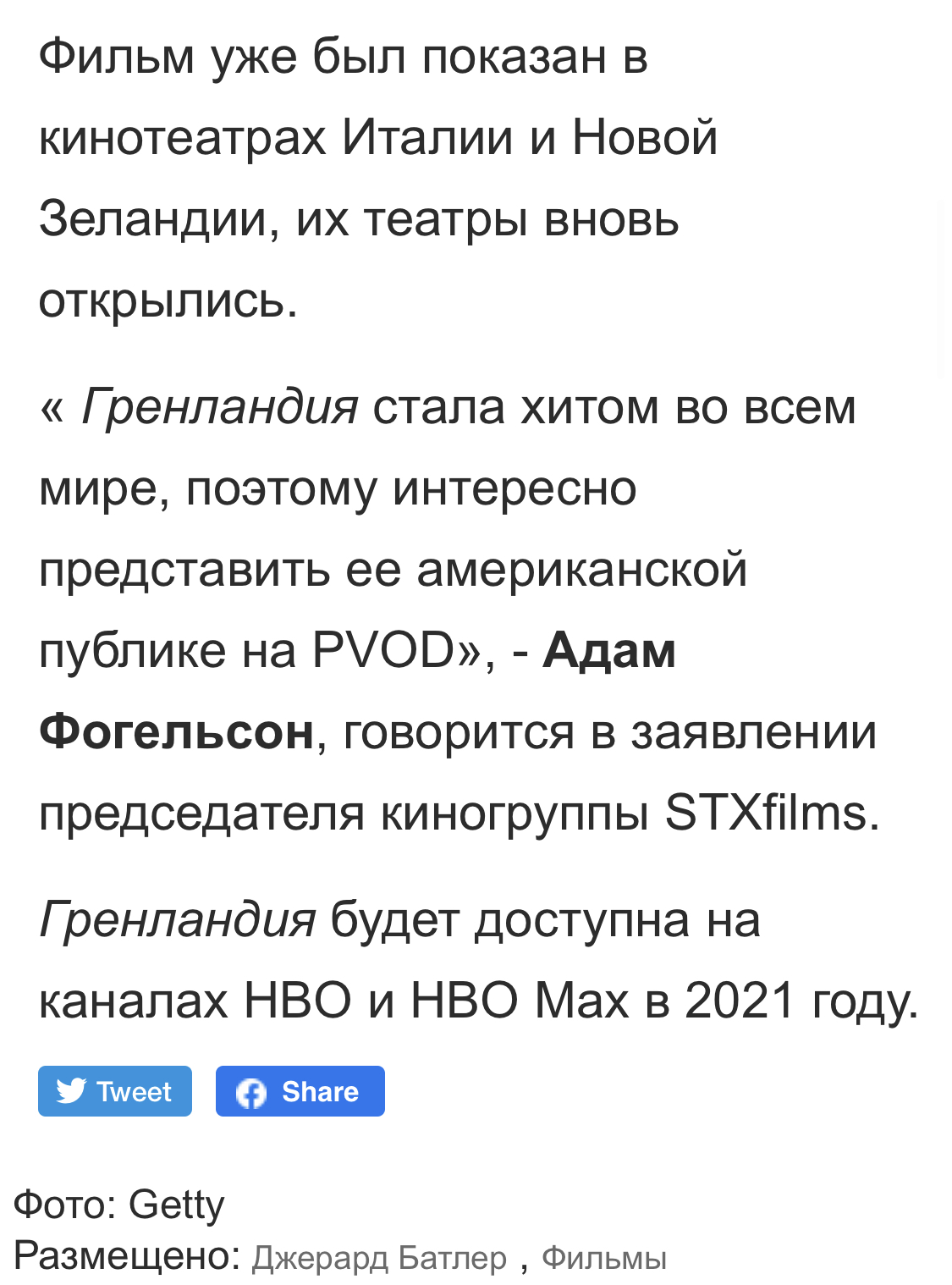 Адам Фогельсон, председатель киногруппы STXfilms, сказал: "Гренландия стала хитом во всем мире, поэтому очень интересно донести ее до американской аудитории на PVOD.”