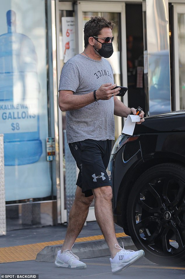 Джерард Батлер продемонстрировал свою мускулистую фигуру в темно-серой футболке после покупки зажигалки и сигарет на заправке в среду