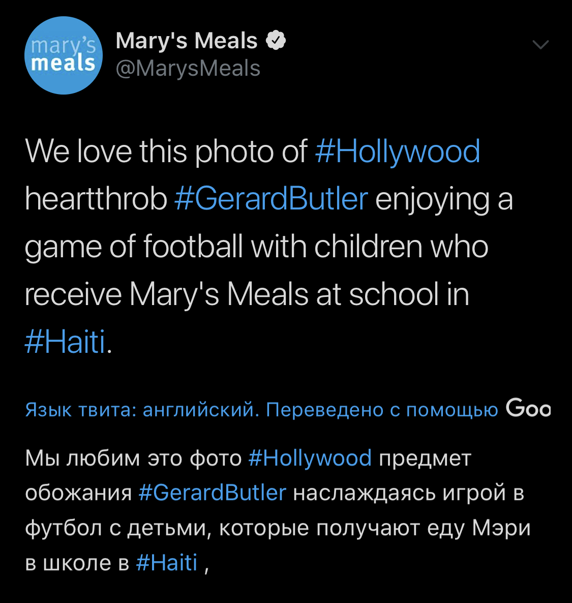 "История за этой картиной ... в конце каждого дня мне приходилось снимать макияж с тела Джерарда Батлера и кусочки бороды. После нескольких месяцев съемок, этот день был как раз перед рождественскими каникулами, Джерри уезжал на следующий день на каникулы, и я подумал попросить нескольких визажистов помочь мне ускорить процесс ... это выражение стоит тысяча слов! Люблю тебя Джерри! Вы были уважительными, скромными, веселыми, щедрыми и доступными для всей команды! У тебя красивая душа и большое сердце!"