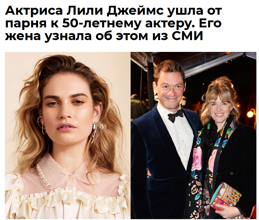 Мимолетный роман 31-летней Лили Джеймс и 51-летнего Доминка Уэста им обоим доставил немало проблем: актриса была вынуждена отменить участие в телешоу Today, а актеру пришлось делать публичное заявление.