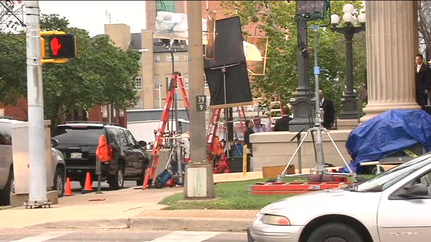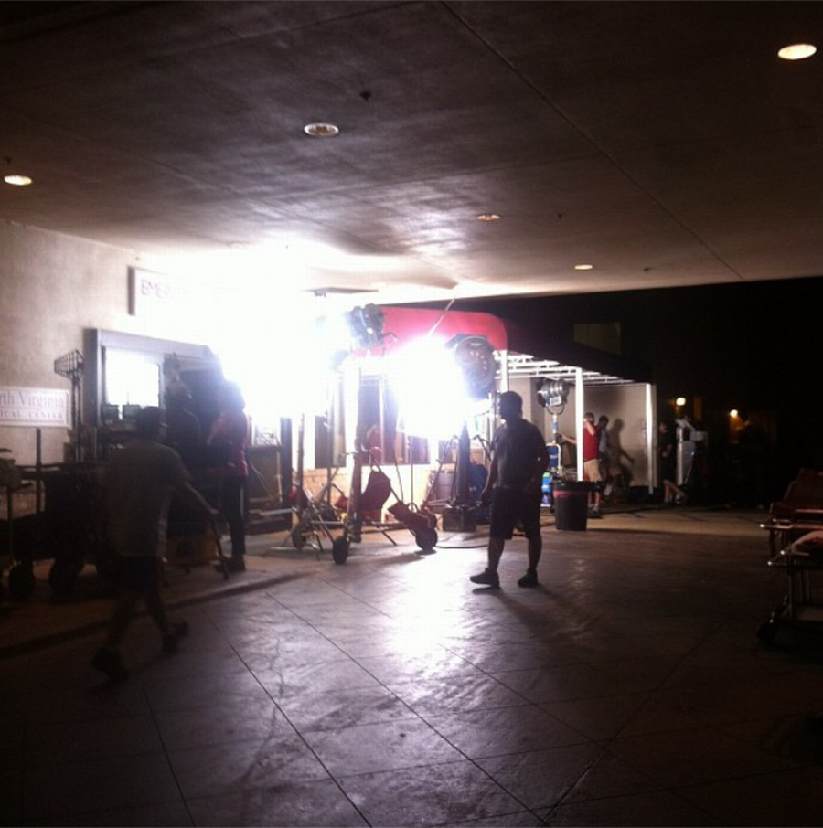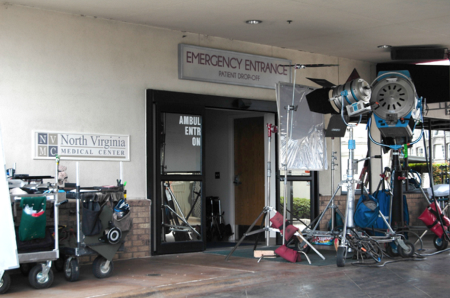 В пятницу 13 июля 2012 г. проходила подготовка к съёмкам в отделении скорой помощи Minden Medical Center. По словам координатора медцентра по маркетингу Дженнифер Сперлок съёмочная группа «Olympus Has Fallen» заменила внутри освещение. Кроме того, некоторые из реальных медсестер сыграли роль статистов. На протяжении всех съёмок отделение неотложной помощи функционировало в штатном режиме. Медики и их пациенты смогли воспользоваться другой дверью. Из звёзд на площадке присутствовала Рада Митчелл (Radha Mitchell), исполняющая роль медсестры.