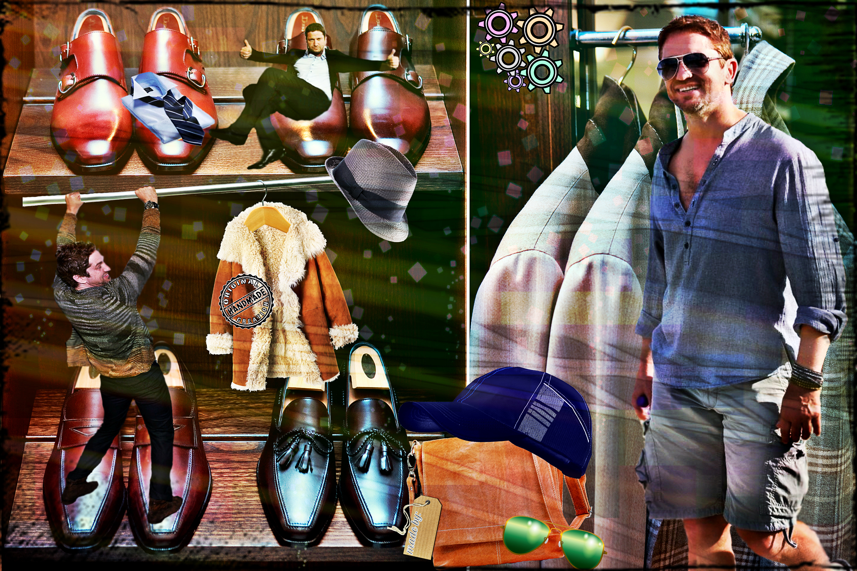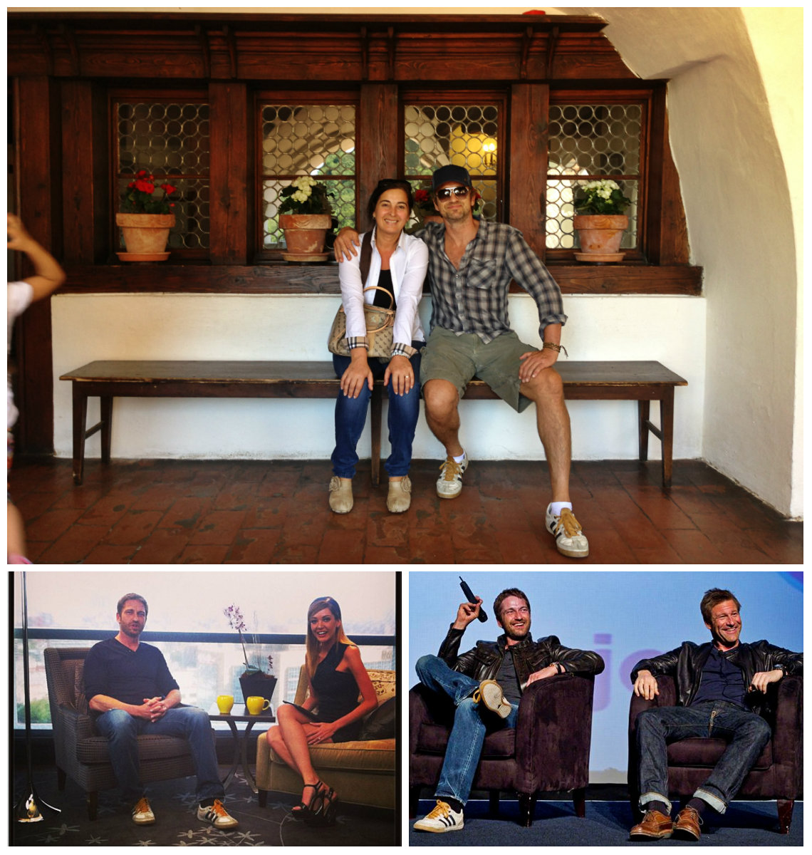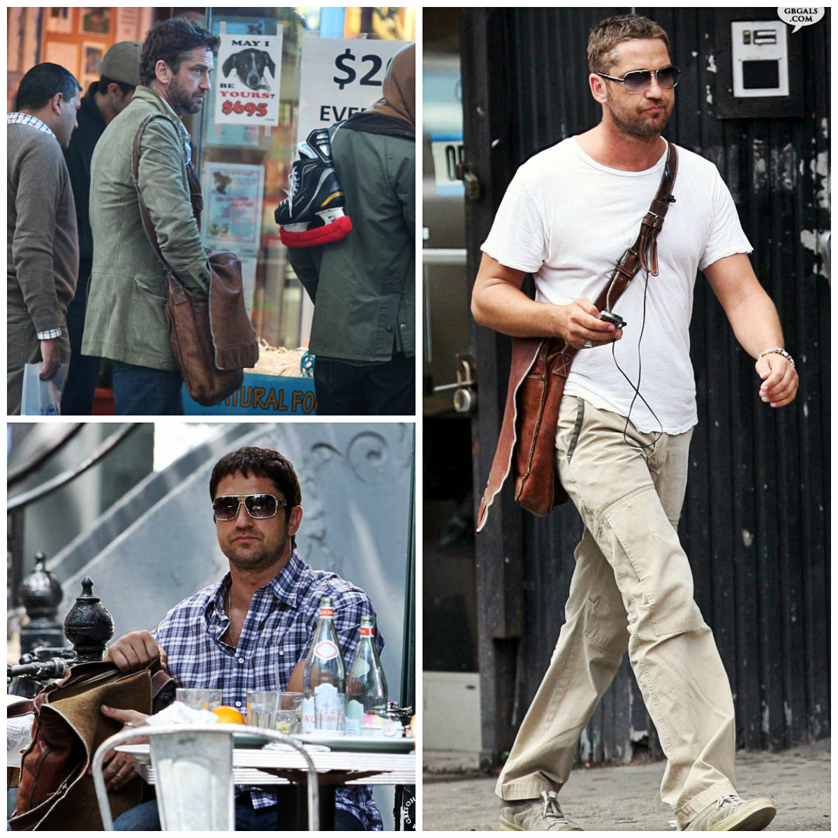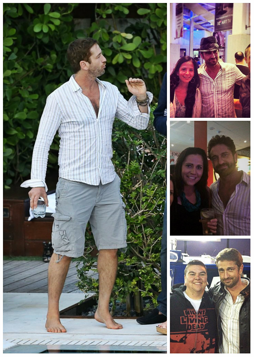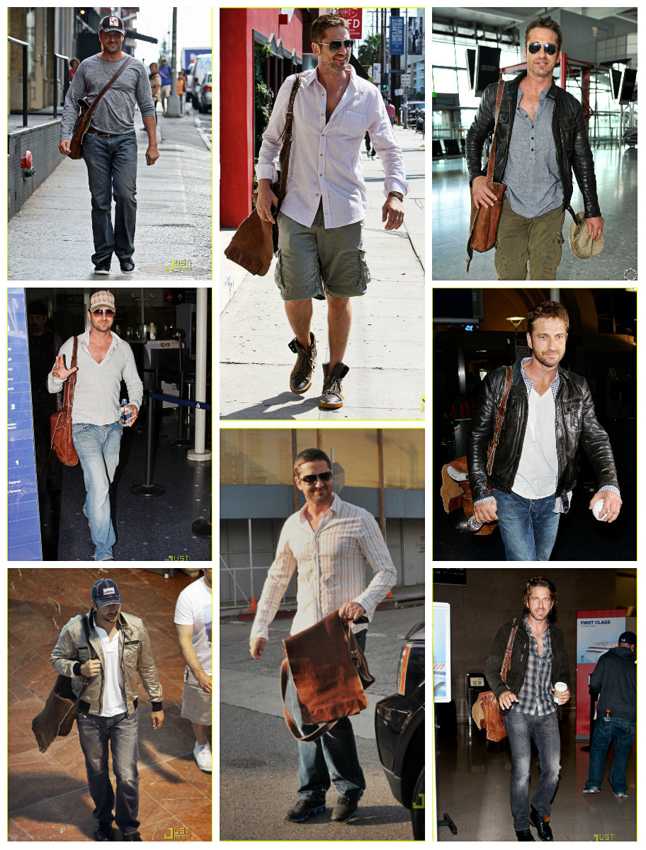 Среди прочего, приоритет можно смело отдать кожаной сумке. Мы не знаем точно дату приобретения, но уже в октябре 2006 года, эта сумка, а вернее, сума переметная уже мертвой хваткой вцепилась в крепкое плечо Батлера. И вот уже на протяжении многих лет редко какая соперница на короткое вырывает это первенство. Старую любовь не забыть! Эта сумка знает все тайны своего хозяина. Чего только не хранила она в своем чреве! Можете домысливать и сочинять что угодно, но тайну она не раскроет никогда, даже под страхом смерти. И тайна эта умрет вместе с ней, хотя она-то как раз умирать не собирается и несмотря на потрепанный внешний вид, выглядит вполне еще ОГО-ГО!!! Доказательство этому прибытие Ее Величества(сумки) в Сидней в марте этого года. Разве какая-то рухлядь смогла бы преодолеть такое расстояние? Ответ легко и непринужденно напрашивается сам собой. Конечно, нет. Поэтому приготовимся любоваться ей еще долгие и долгие лета. Тем более, что рядом такой преданный человек- Джерри Батлер, а рядом с таким хозяином — красивым, сильным, надежным годы не ощущаются вовсе. "Люди привыкают к определённым вещам, привязываются к ним, как к домашним питомцам, любят их не только за удобство использования, но порой и за то, что данная вещь стала свидетелем того или иного радостного события или, напротив, трудного периода в их жизни, который, к счастью благополучно завершился." На этом наши расследования не заканчиваются. И мы плавно (или не очень) переходим к любимым шортам Джерри (подобного стиля он придерживается с 2010 года). Казалось бы, а с ними -то что? Ведь любой человек, прилетев в любую точку мира может без проблем купить за копейки этот предмет гардероба… Да, может, но не Джерри. И скорее всего не из-за того, что финансы не позволяют. Вернее, может и покупает, разные там экземпляры … Но эти! Эти — незаменимы! Потому что, как поется в известной песне, «не отрекаются любя». И эти шорты повсюду слепо следуют за хозяином. И одновременно привлекают взгляды и хранят самое святое. Иногда любимые вещи встречаются и играют как бы в одном кино, а режиссер их жизни и ролей — Джерри Батлер. Так же с 2010 года на актере можно наблюдать не менее любимые шорты цвета хаки. Мельком пробежим по футболкам. Пляжи, пробежки и встречи. Разнообразные амплуа делают их незаменимыми. Например, с того же 2010 года Джерри частенько прогуливался в серой футболке »Сolorado», в которой впервые был замечен на карнавале в Бразилии С сентября 2008 года незаменимым атрибутом гардероба Джерарда Батлера стала белая рубашка в полоску.