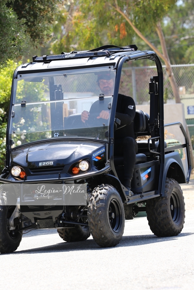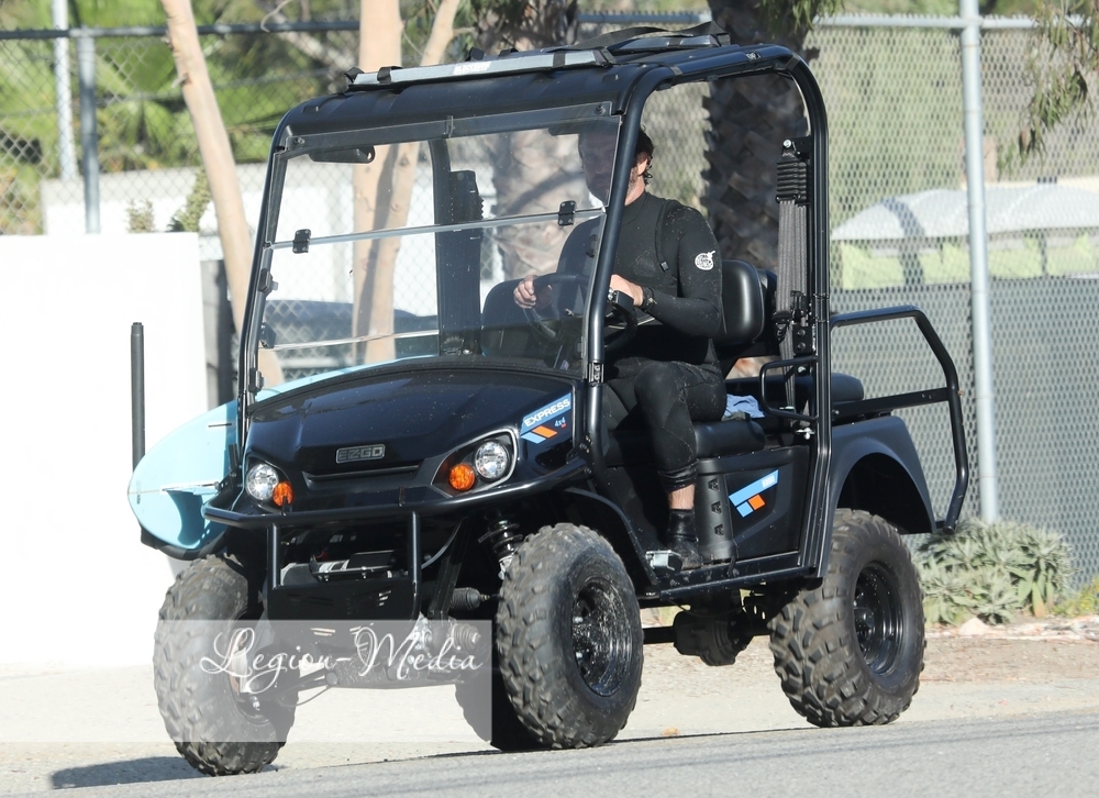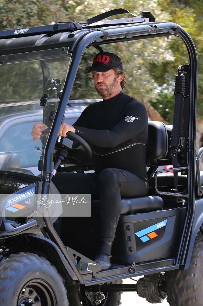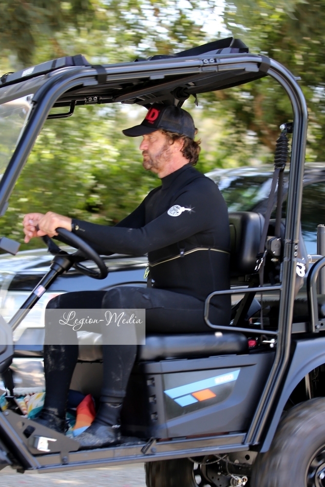 Gerard Butler Drives His Express Golf Cart Back To His House Wearing His Wetsuit After Getting In A Surf Session In Malibu.