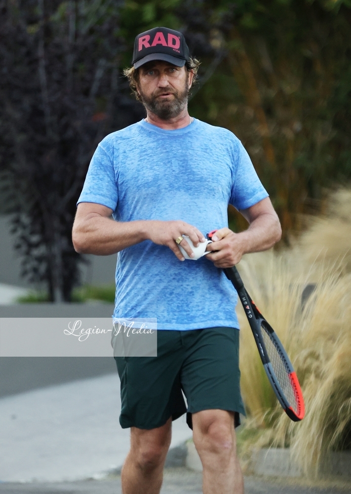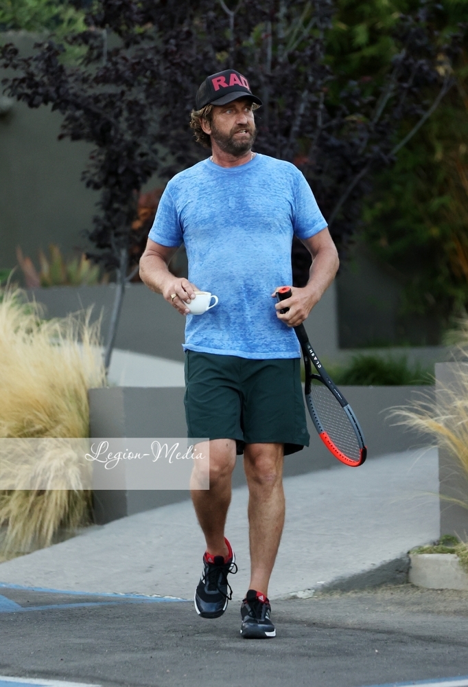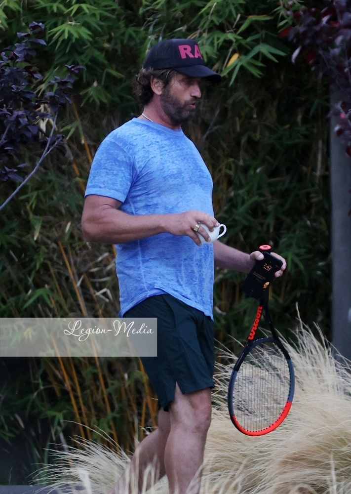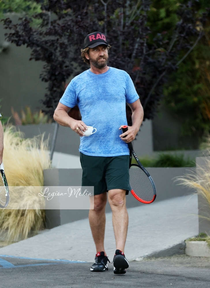 Джерард Батлер Весь Вспотел, Держа В Руках Чашку Чая, Уходя После Игры В Теннис С Другом В Малибу.