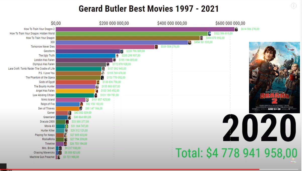 Новый анимационный ролик в котором сравнивается финансовая успешность фильмов с Джерардом Батлером. Фильмы появляются в хронологическом порядке и в зависимости от суммы сборов поднимаются вверх. В итоге на вершине оказались три мультфильма из серии "Приручить дракона", затем "300 спартанцев", а затем " Завтра не умрет никогда" ( фильм, где Батлер появляется в совсем крошечном эпизоде), затем "Геошторм".