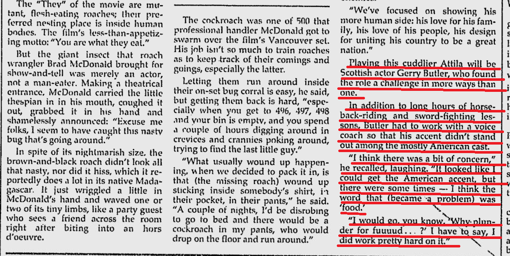 Это небольшая статья за 2000 год. Там буквально два слова о Батлере, как он готовился к роли Аттилы. У меня большая просьба, кто хорошо знает английский-переведите подчёркнутое, пжлста.