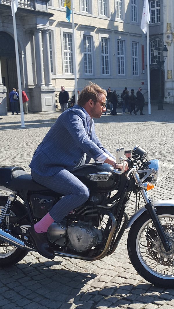 Aan alle deernes uit Brugge, Matthias Schoenaerts in kostuum en roze sokken op de moto op de Burg. @StadBrugge