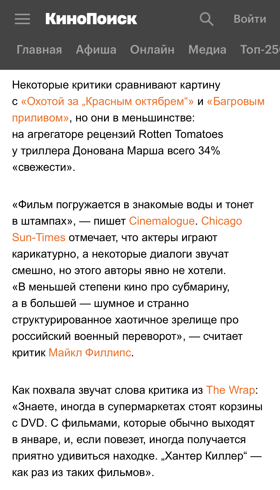 Девочки, вчера сходила в кино и посмотрела Хантер килер.У нас он распространяется с заголовком Уничтожитель по имени подлодки.Что сказать-один из многих. Не буду рассказывать фильм,чтоб все кто посмотрять его будет интересен.По сценарию сюжет фильма смесь Карибского кризиса,когда мир был на пороге новой войны и пуч против Михаила Сергеевича Горбачева.Но ситуированного в наши дни-после присоидинения Крыма к России.Много взрывов,много спецэфектов,много эфектов,мало Джерра.Да,хотя его героя презентовали как главного героя спасшего русского президента-его презентовали как Владимировича Путина-не он спас его.Спасли президента 4 американских рейнджерив,экипаж русского коробля Емченко,его бывший командир кап Андропова(которого герой Джерра кап Джон Гласс взял военнопленником)Джон Гласс только спрятал его на подлодке.Фильм не шедевр,но съедобный-можно проглотить.Джерр как и во всех фильмах играетпо полной.Остальные тоже стараются.Мне понравилась игра актера сыгравшего кап Андропова.Немногословный,но красноречивый.Кстати этого актера,я смотрела и в другом фильме,но сейчас не могу вспомнить-может припомните.И еще мне понравился епизод в нчале фильма где герой Джерра был на охоте,хотел пристрелить оленя спортивным луком,но в тот момент увидел косулю с маленьким и его рука опустилась .В этот момент я почти физически ощутила доброту не только героя,но и самого Джерри